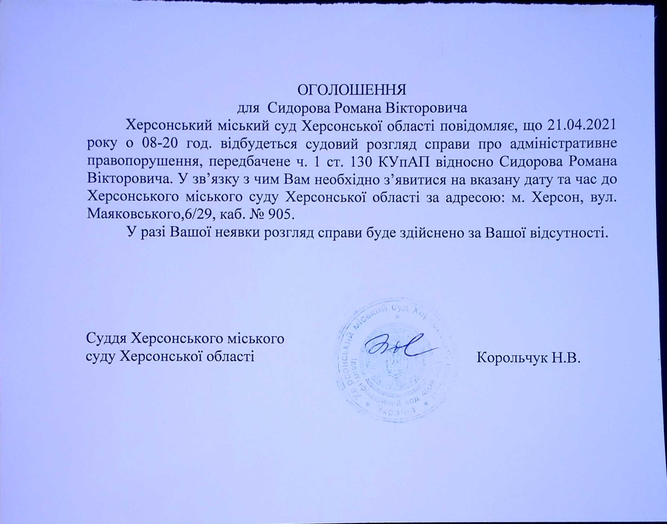 ОГОЛОШЕННЯ для Сидорова Романа Вікторовича