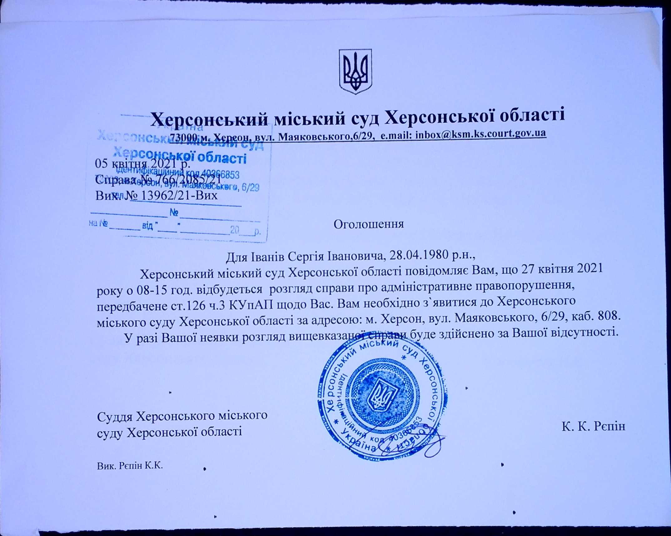 ОГОЛОШЕННЯ ПРО ВИКЛИК ДО СУДУ