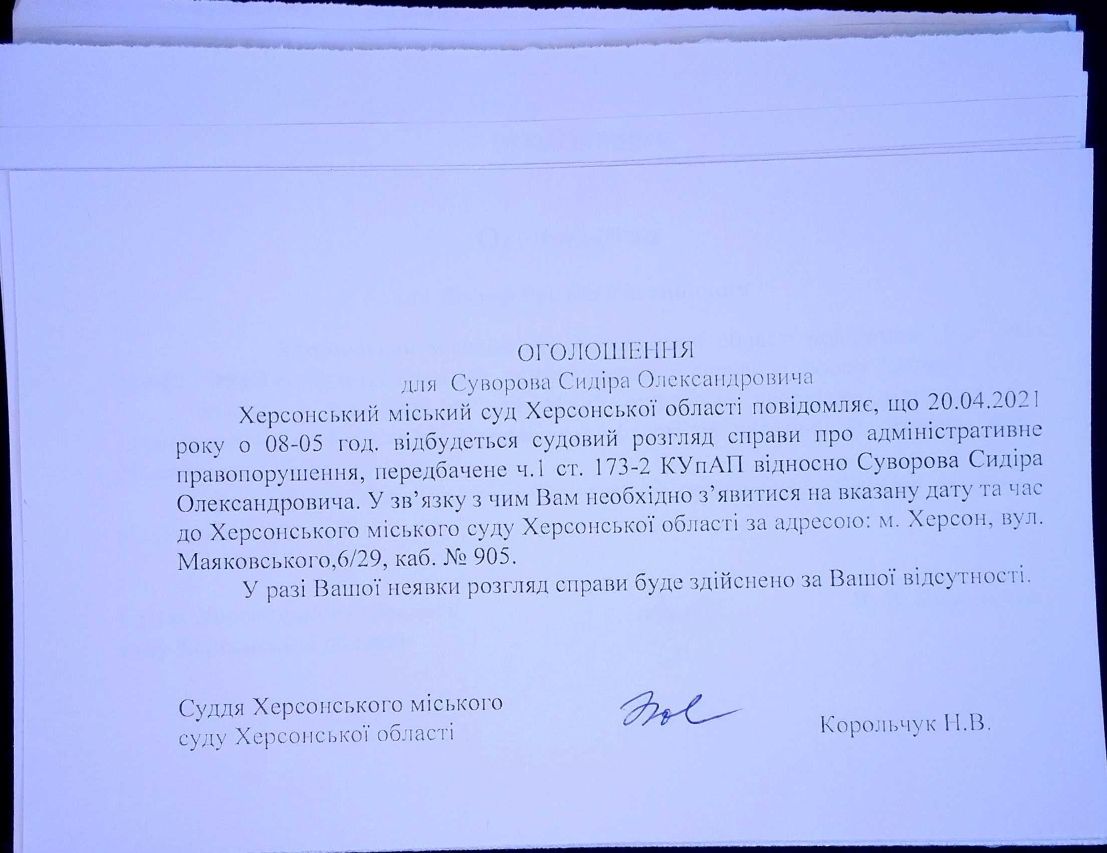 ОГОЛОШЕННЯ для Суворова Сидіра Олександровича