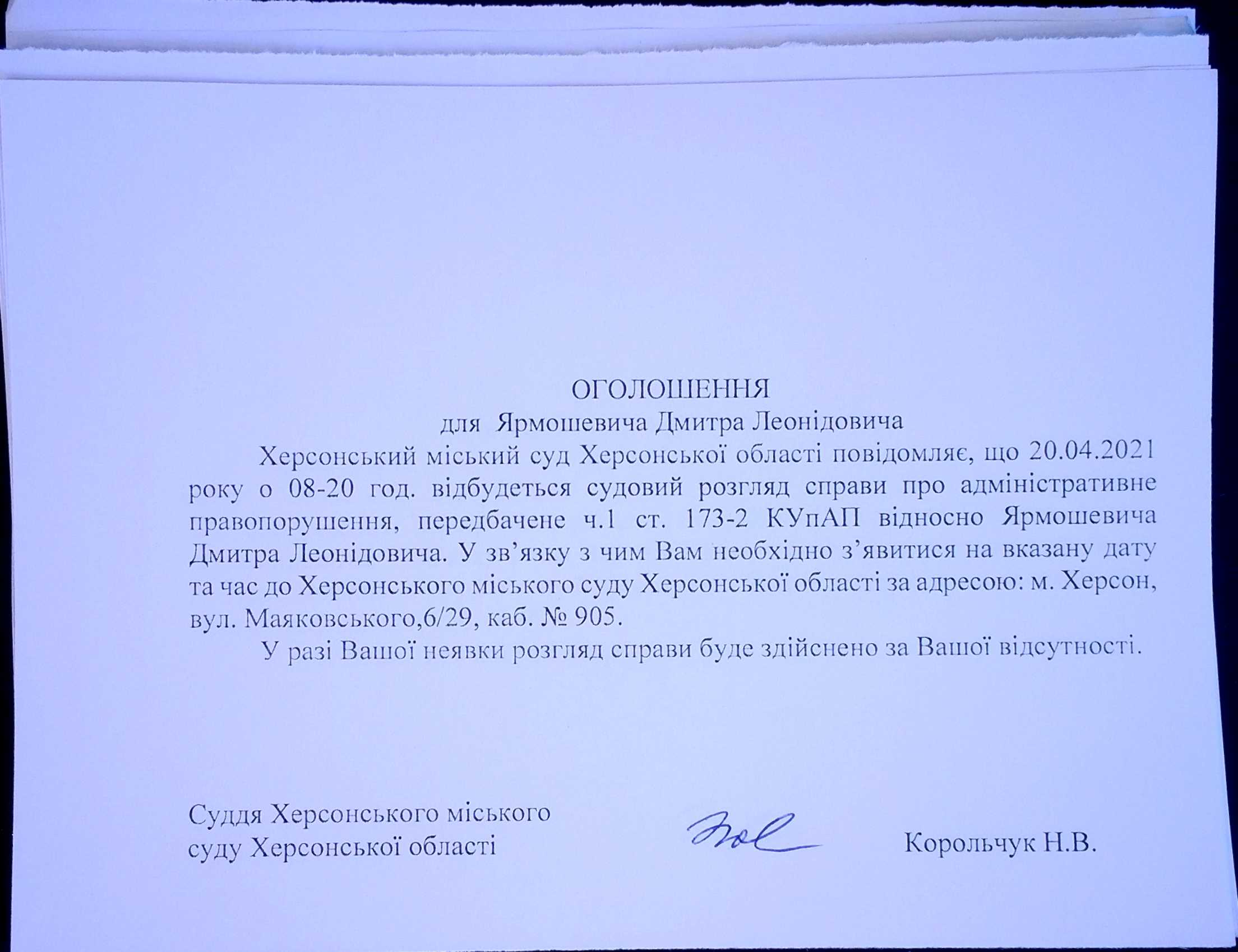 ОГОЛОШЕННЯ ПРО ВИКЛИК ДО СУДУ