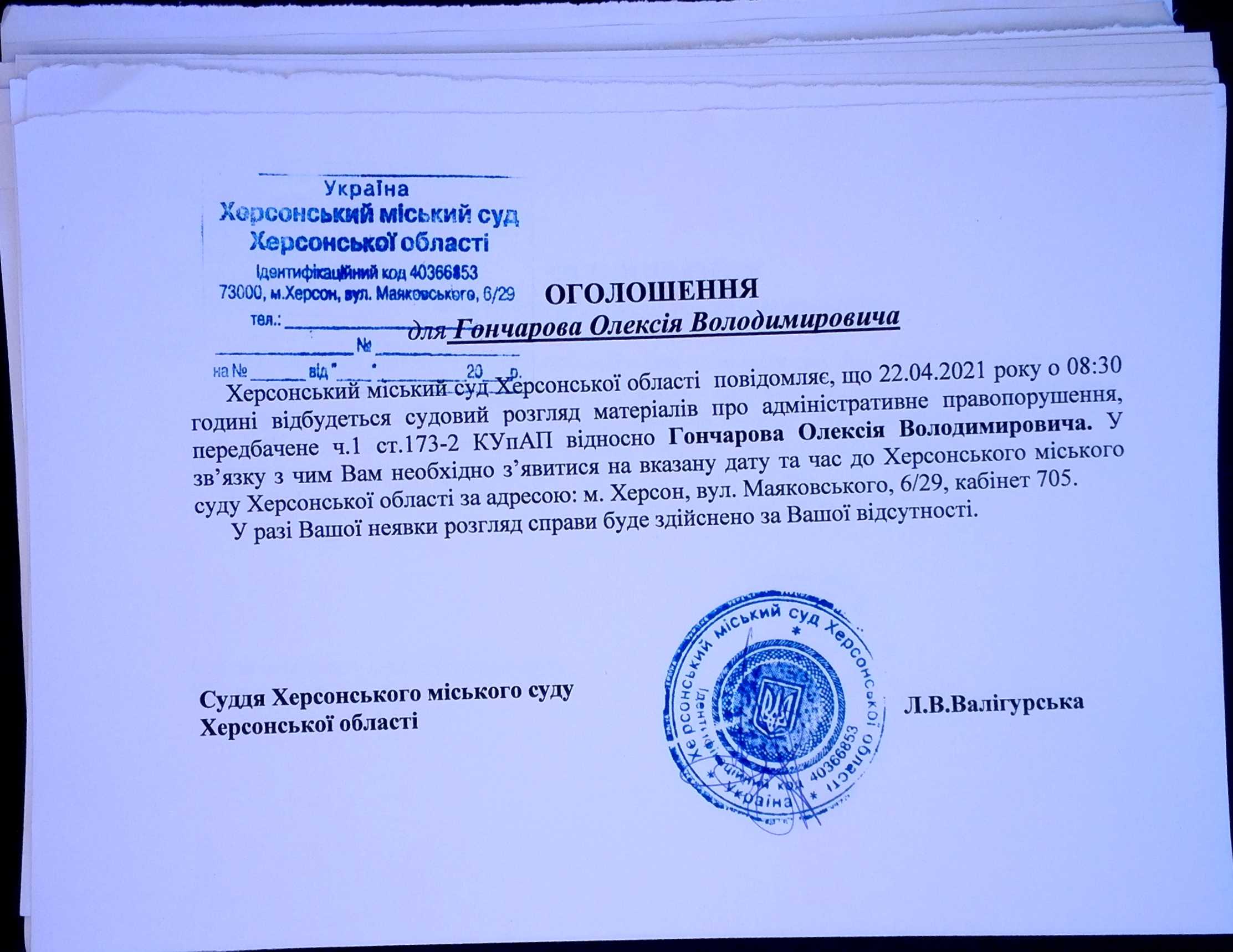 ОГОЛОШЕННЯ для Гончарова Олексія Володимировича