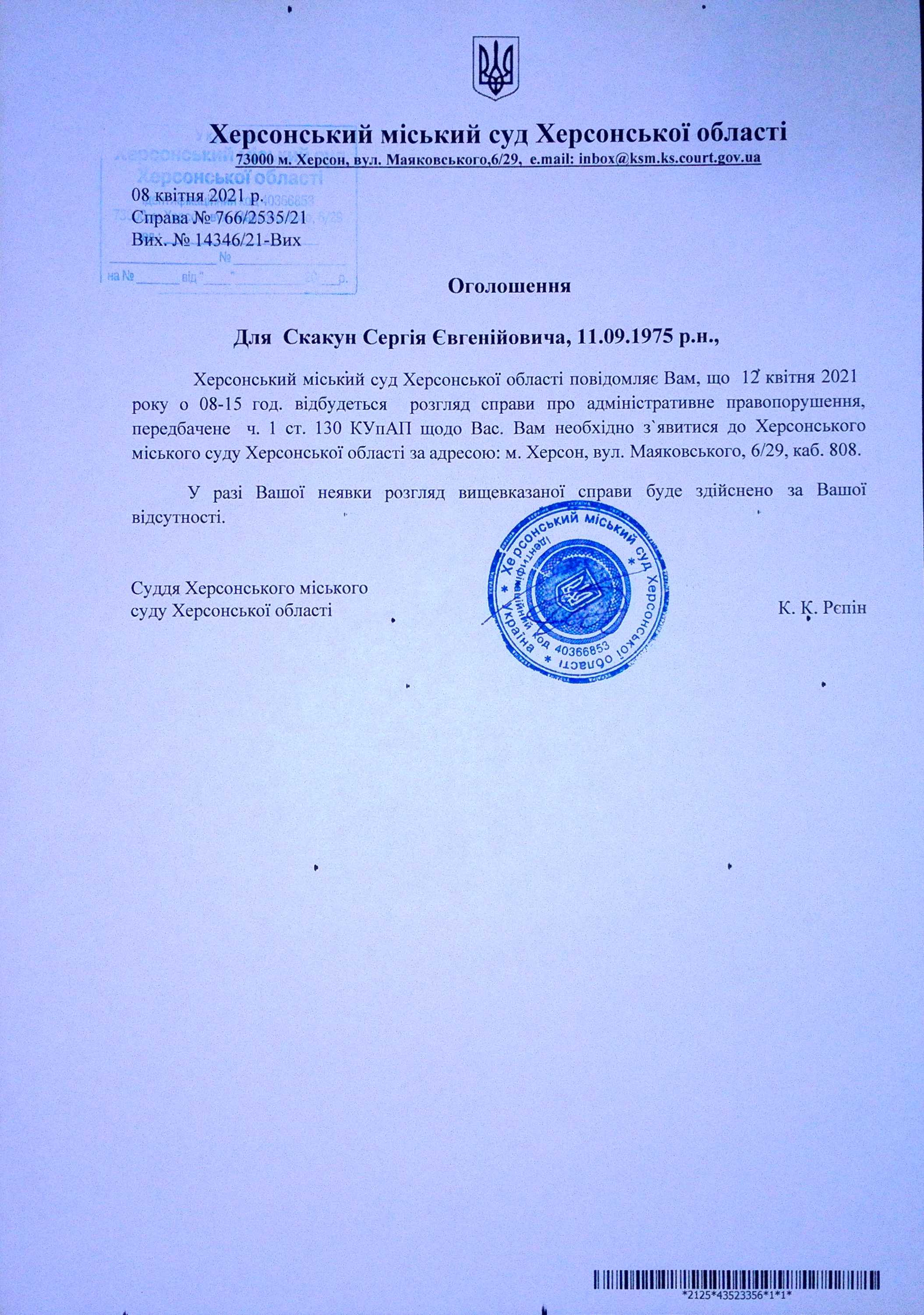 ОГОЛОШЕННЯ для Скакун Сергія Євгенійовича
