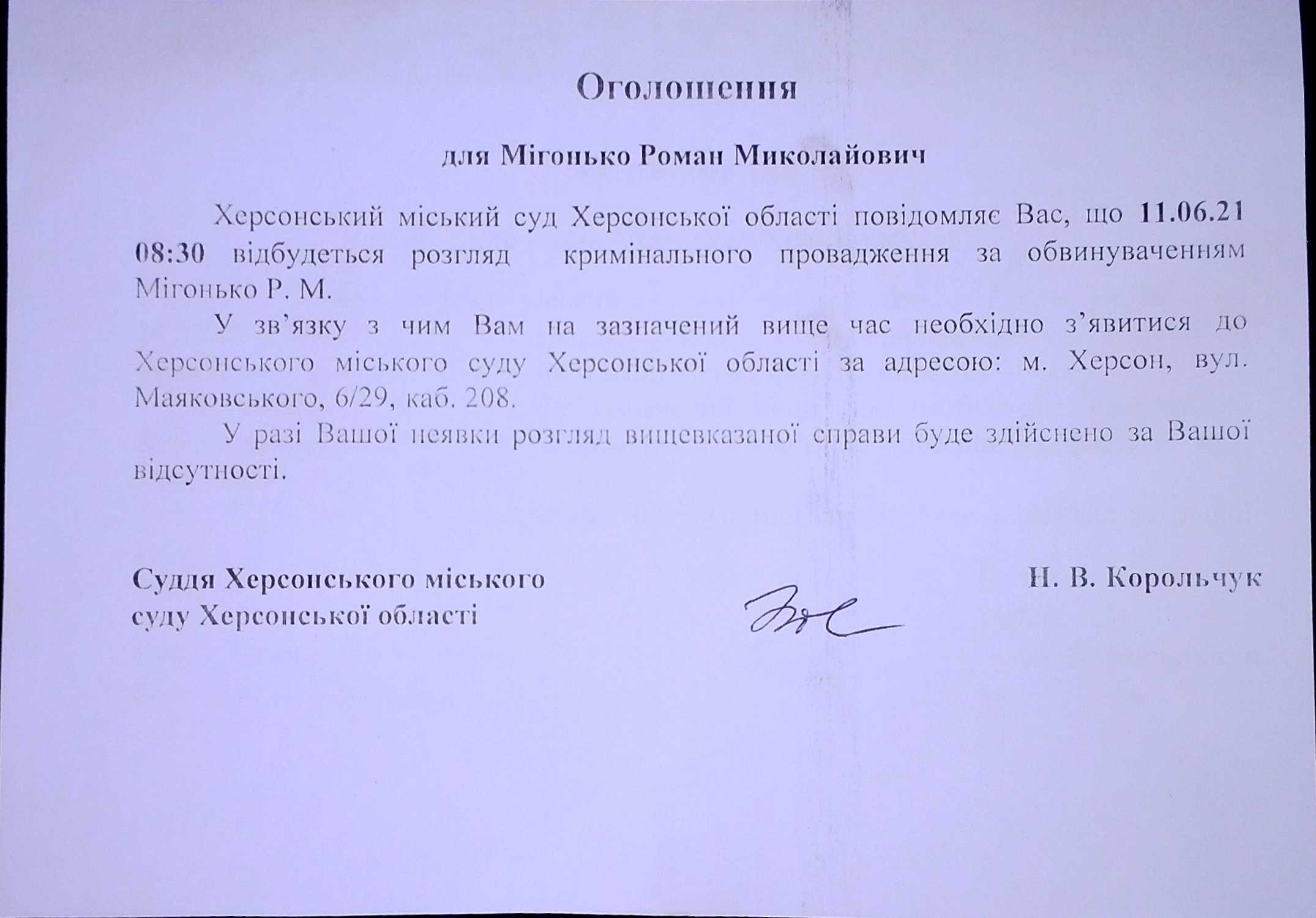 ОГОЛОШЕННЯ для Мігонько Романа Миколайовича