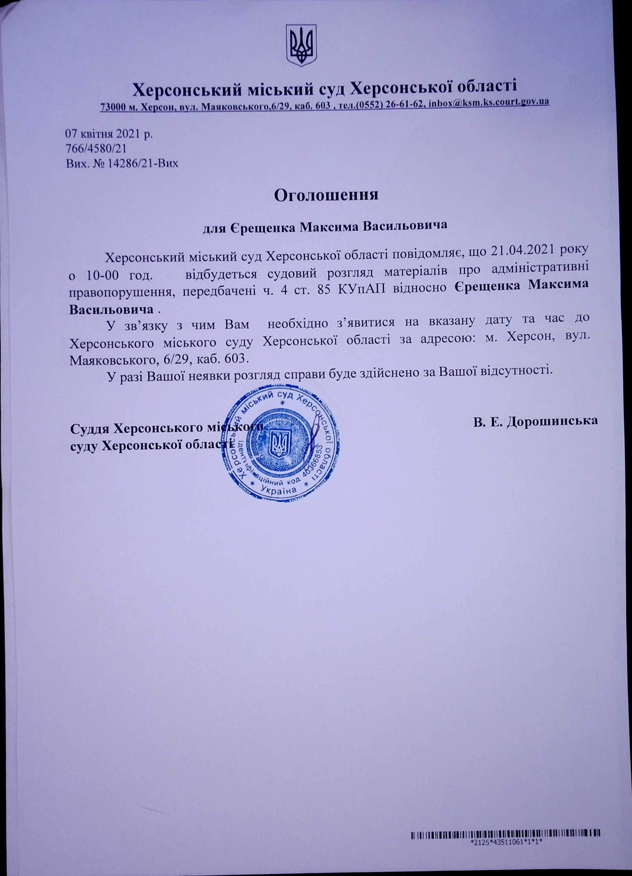 ОГОЛОШЕННЯ для Єрещенка Максима Васильовича