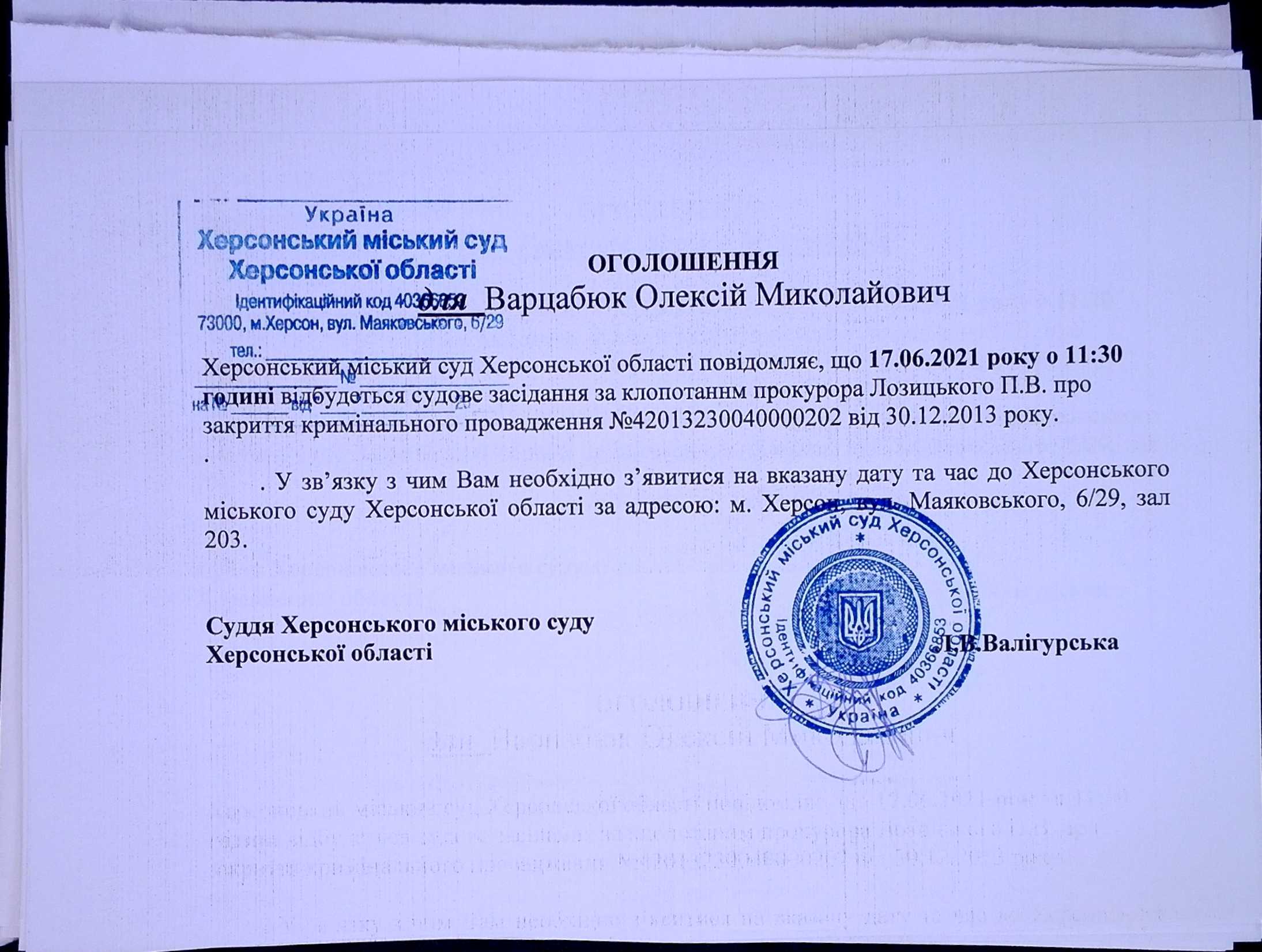 ОГОЛОШЕННЯ для Варцабюк Олексія Миколайовича