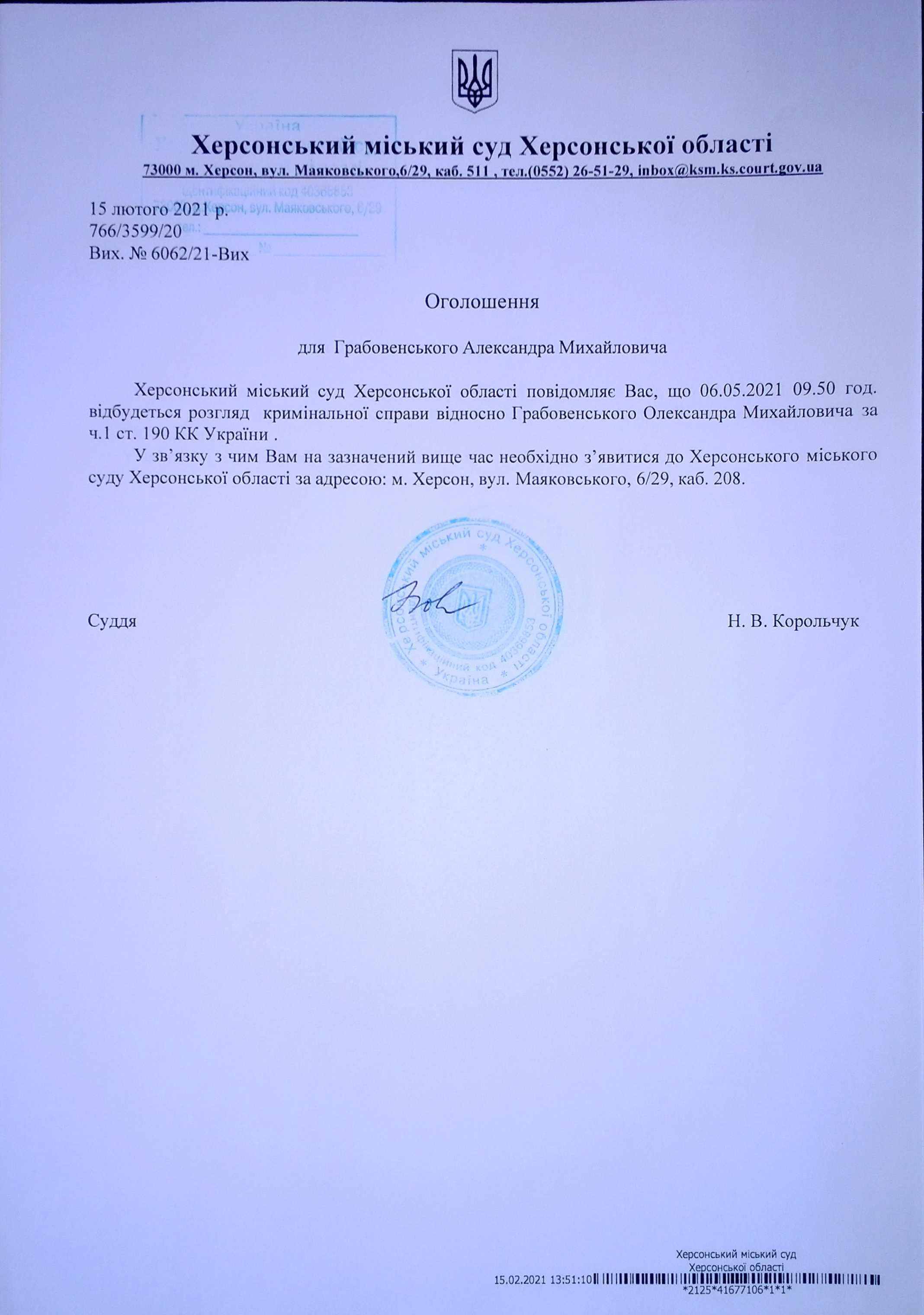 ОГОЛОШЕННЯ ПРО ВИКЛИК ДО СУДУ