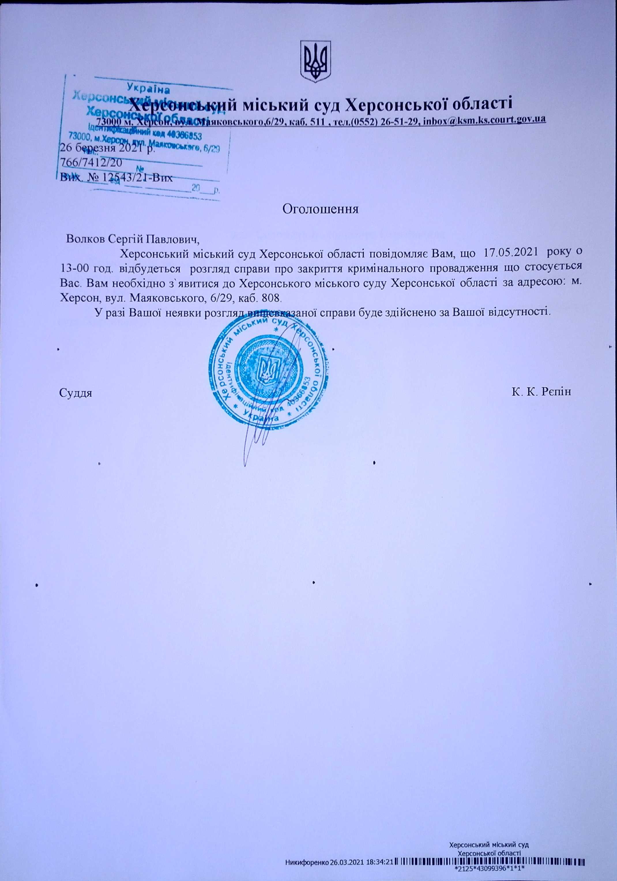 ОГОЛОШЕННЯ для Волкова Сергія Павловича