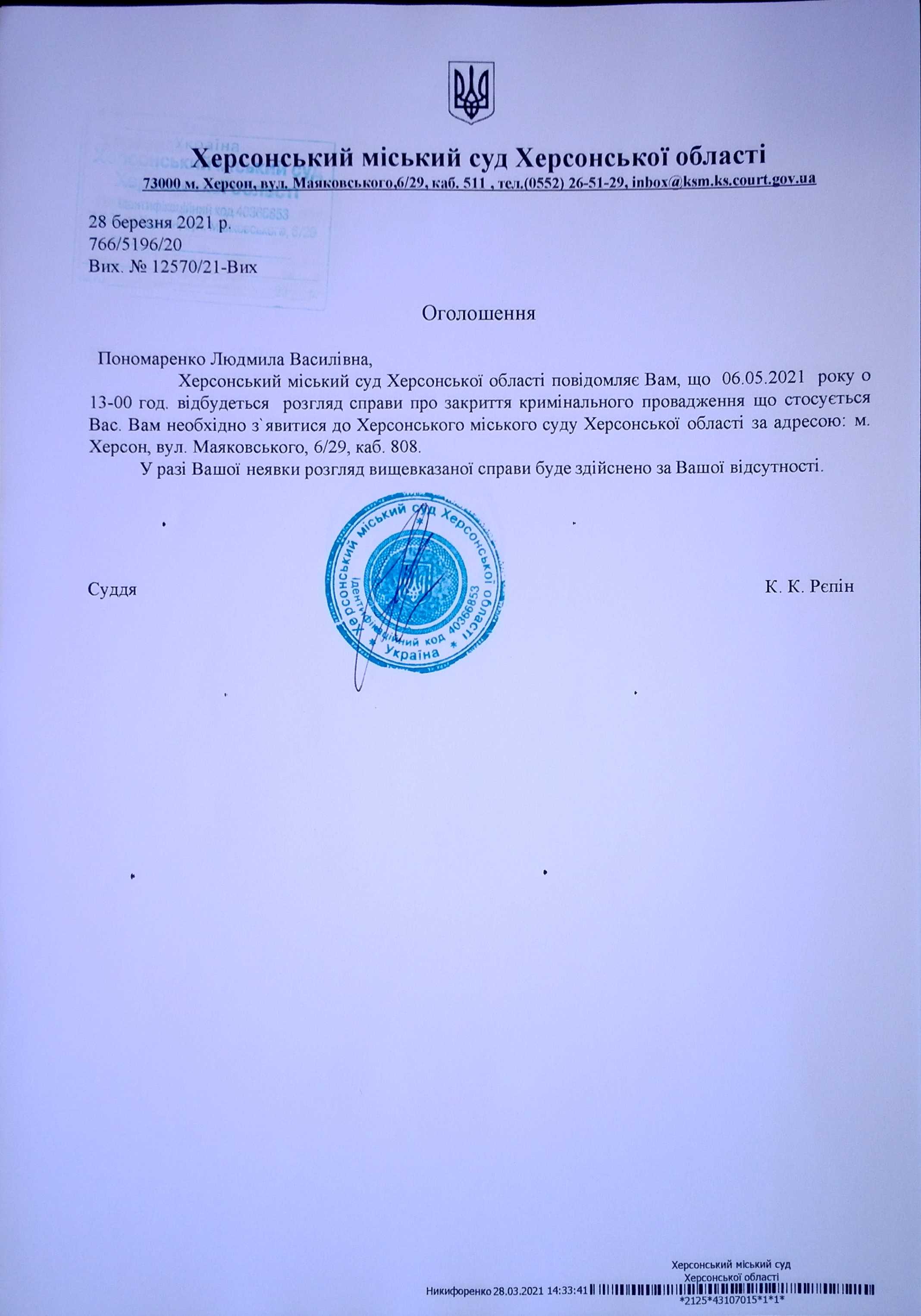 ОГОЛОШЕННЯ ПРО ВИКЛИК ДО СУДУ