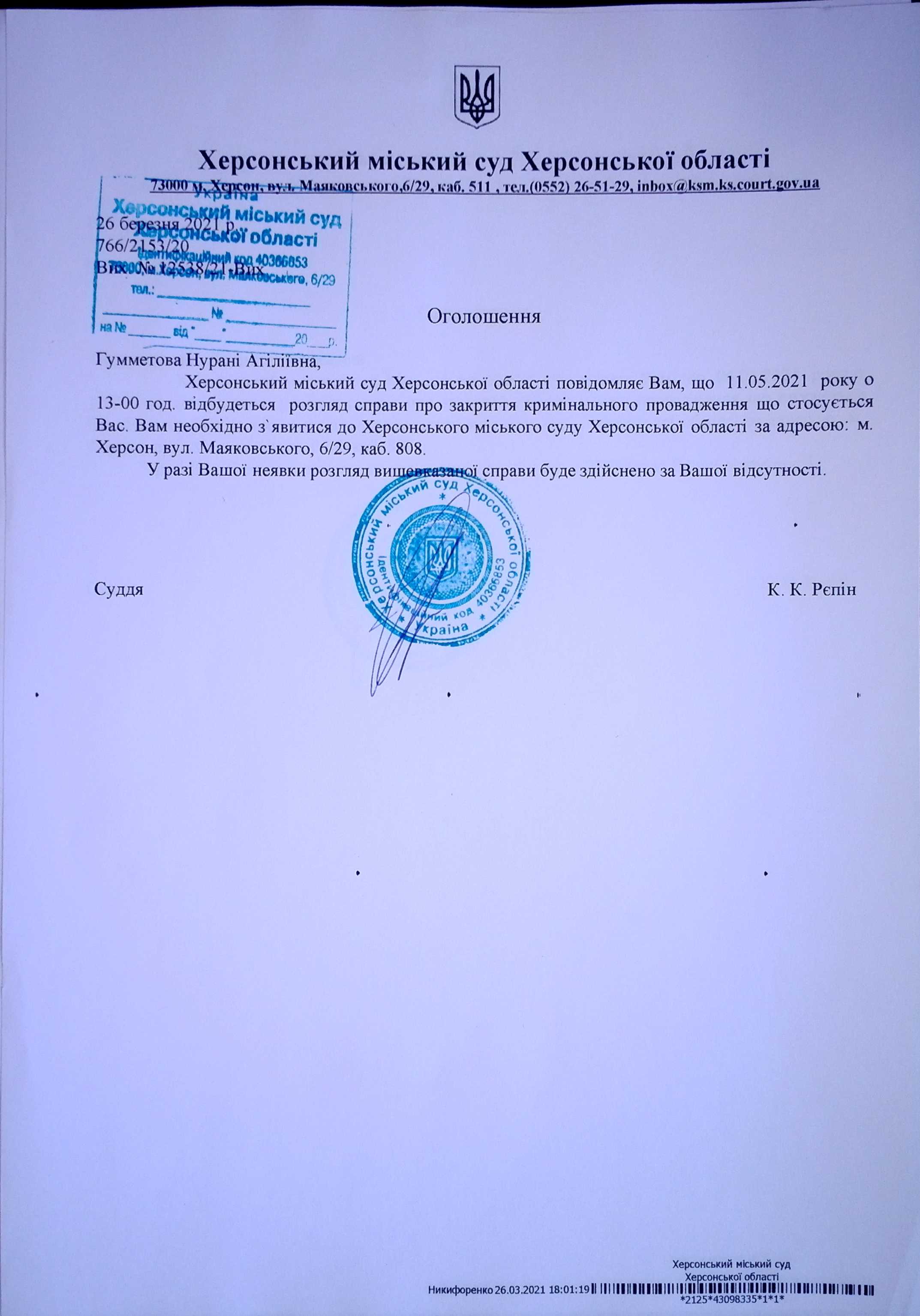ОГОЛОШЕННЯ для Гумметова Нурані Агіліївна