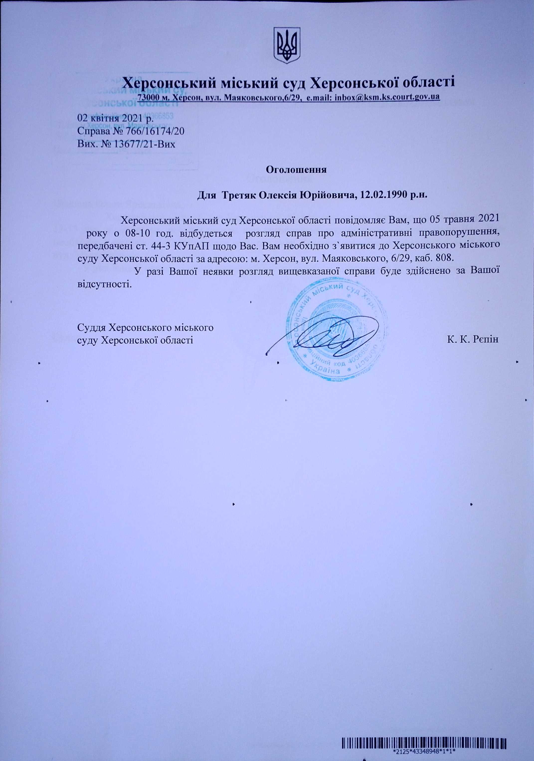 ОГОЛОШЕННЯ для Третяк Олексія Юрійовича
