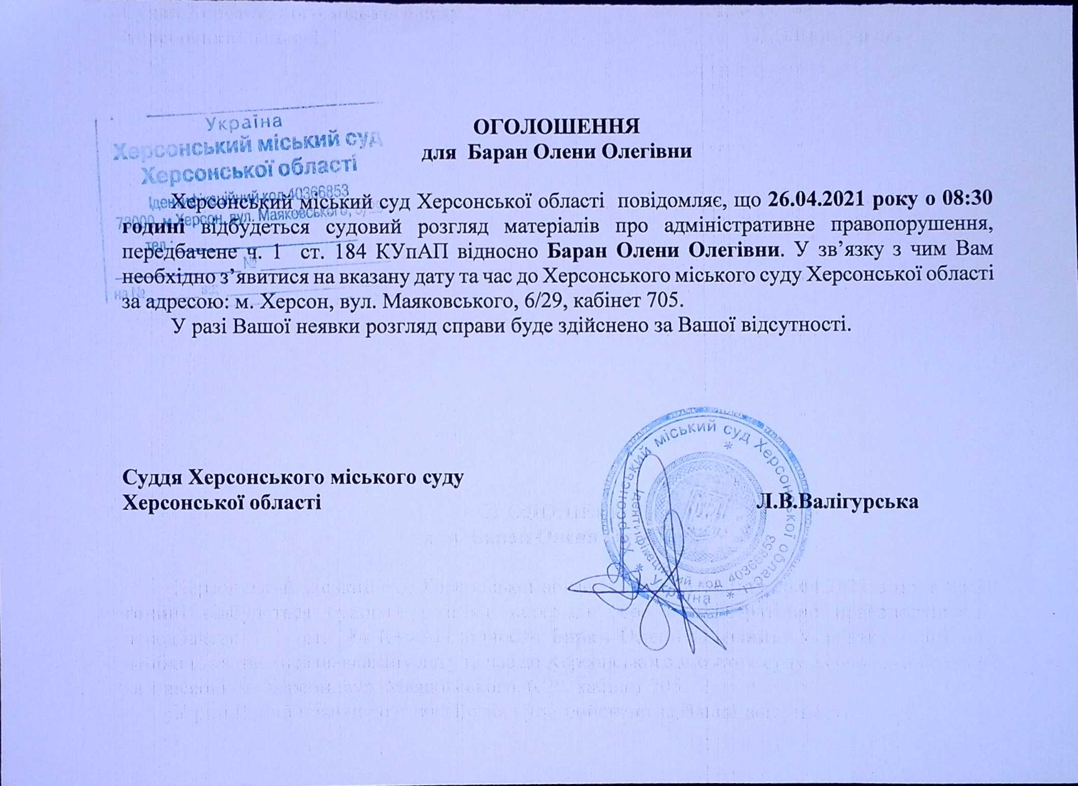ОГОЛОШЕННЯ для Баран Олени Олегівни