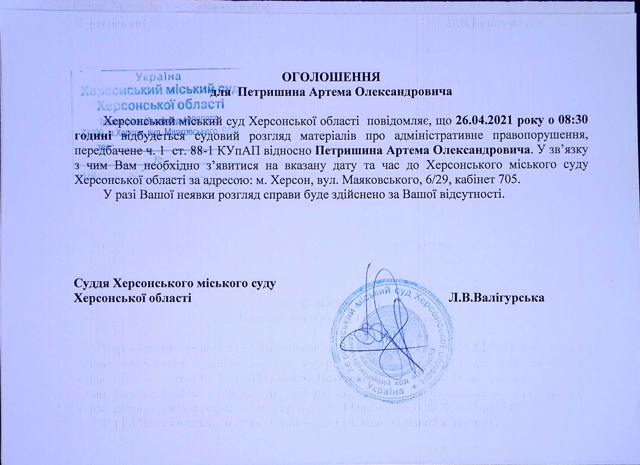 ОГОЛОШЕННЯ для Петришина Артема Олександровича