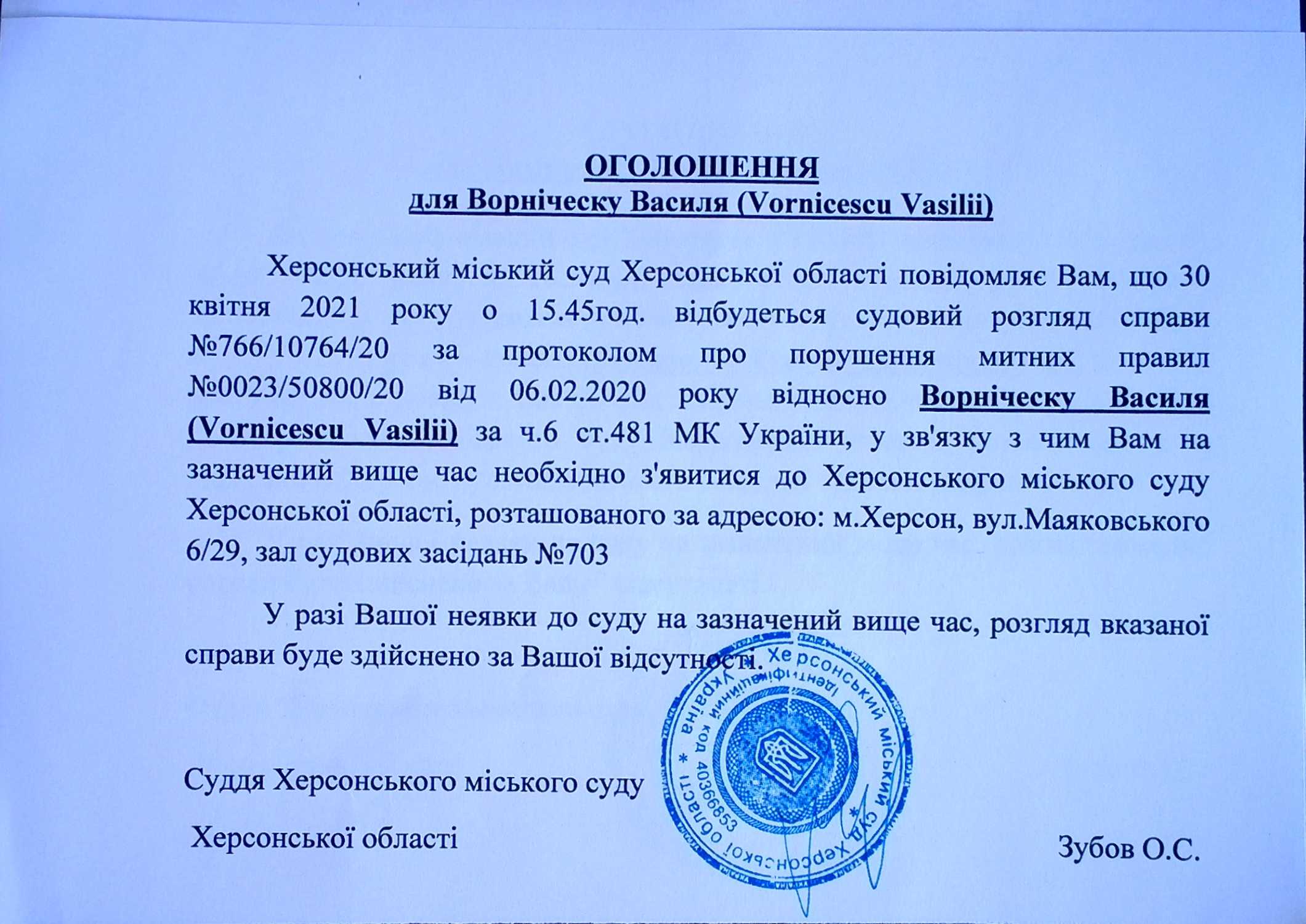 ОГОЛОШЕННЯ для Ворніческу Василя (Vornicescu Vasilii)