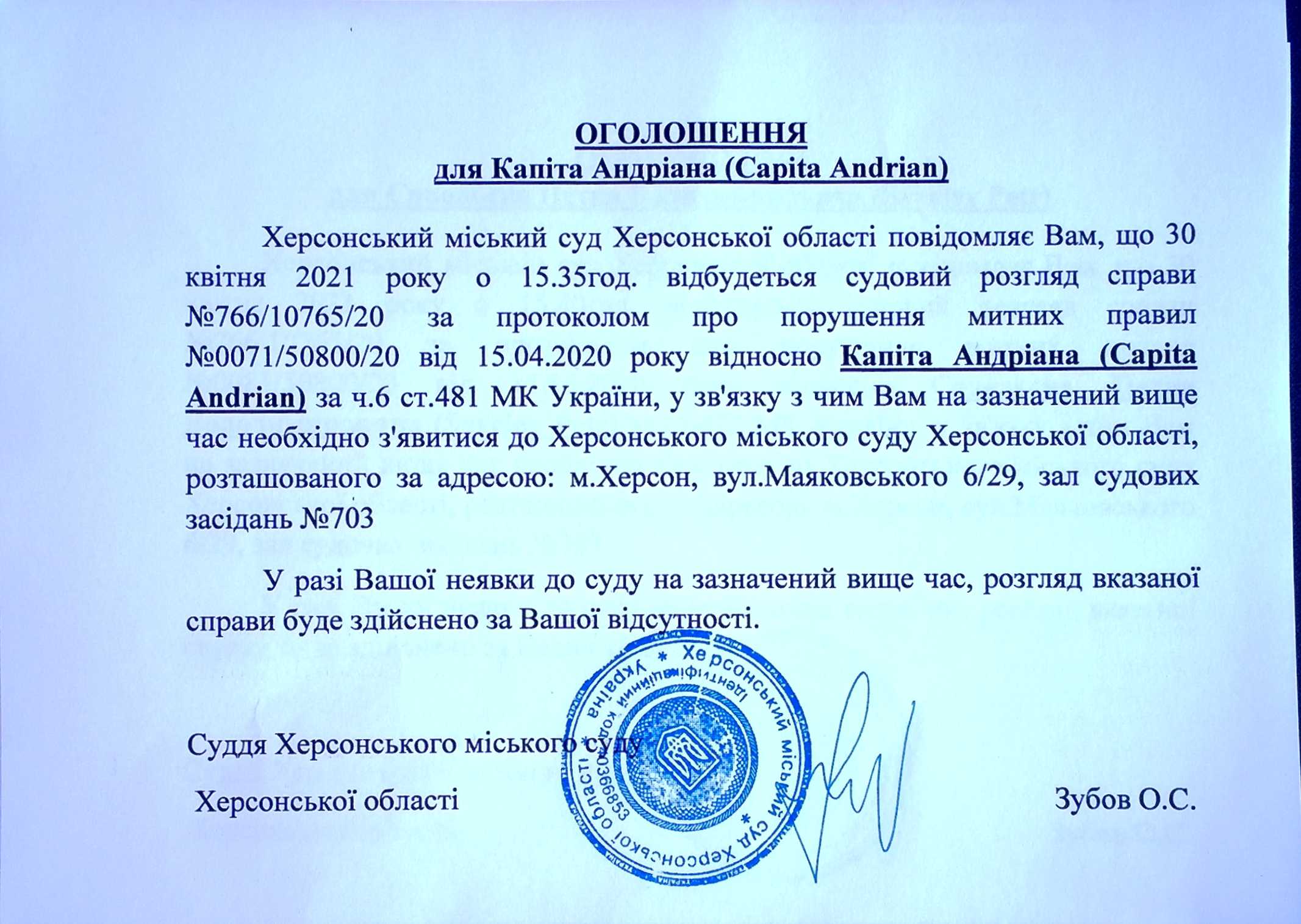 ОГОЛОШЕННЯ ПРО ВИКЛИК ДО СУДУ