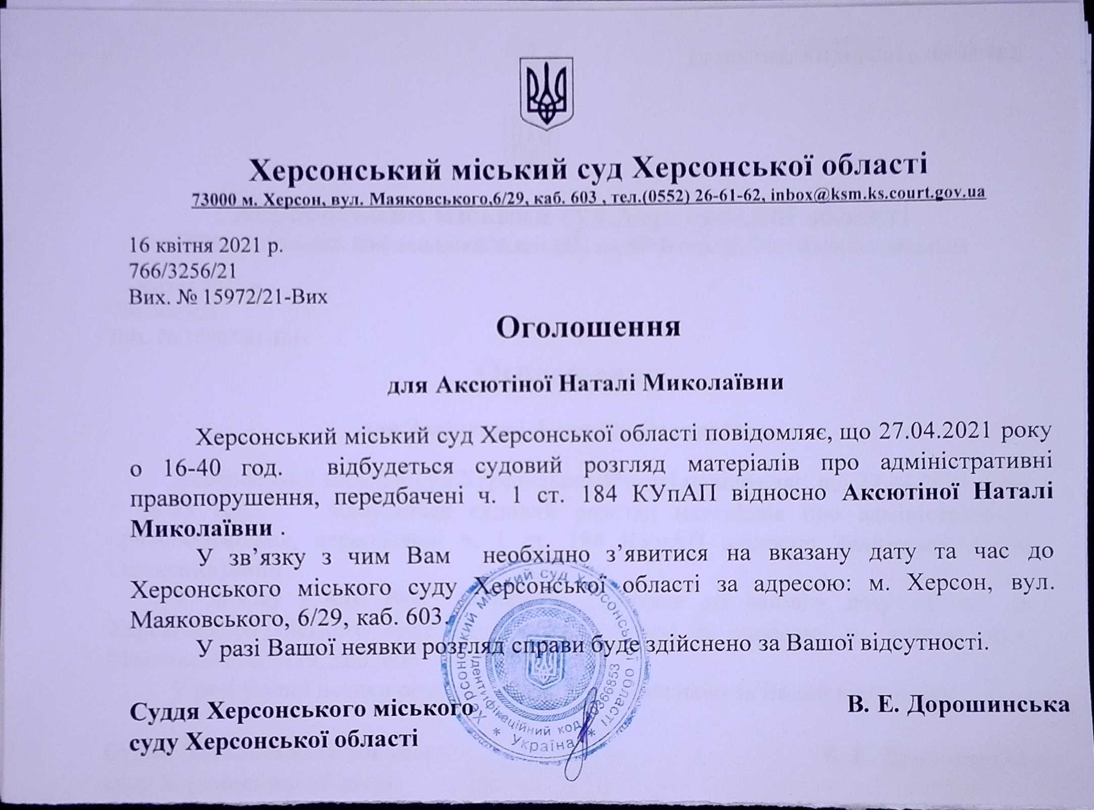 ОГОЛОШЕННЯ для Аксютіної Наталі Миколаївни