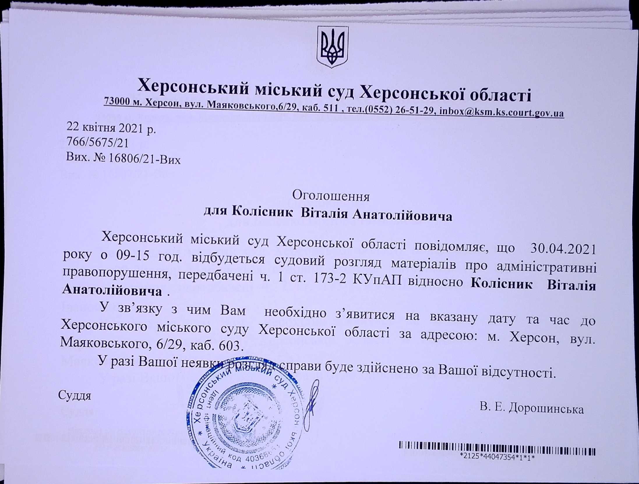 ОГОЛОШЕННЯ для Колісник Віталія Анатолійовича
