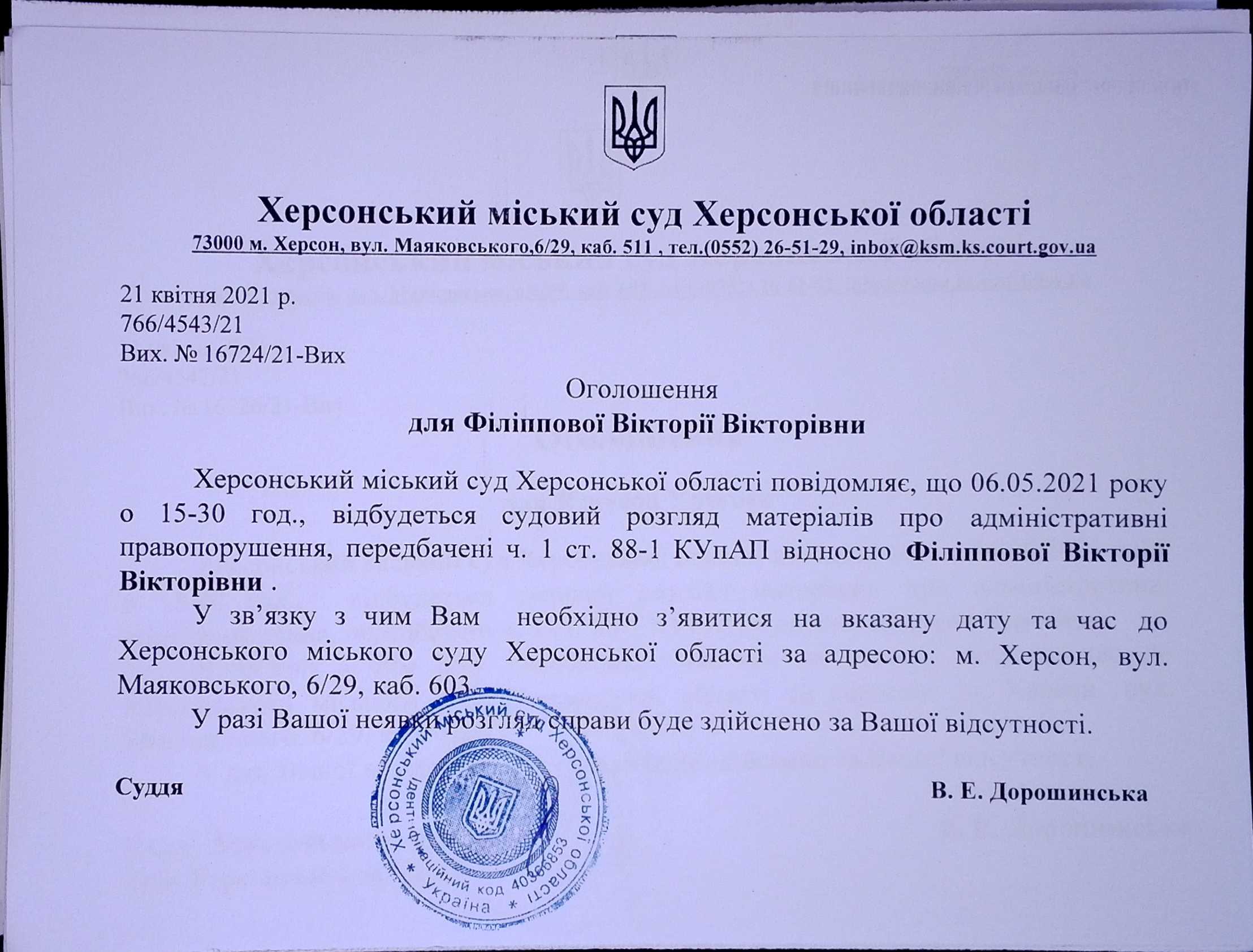 ОГОЛОШЕННЯ для Філіппової Вікторії Вікторівни