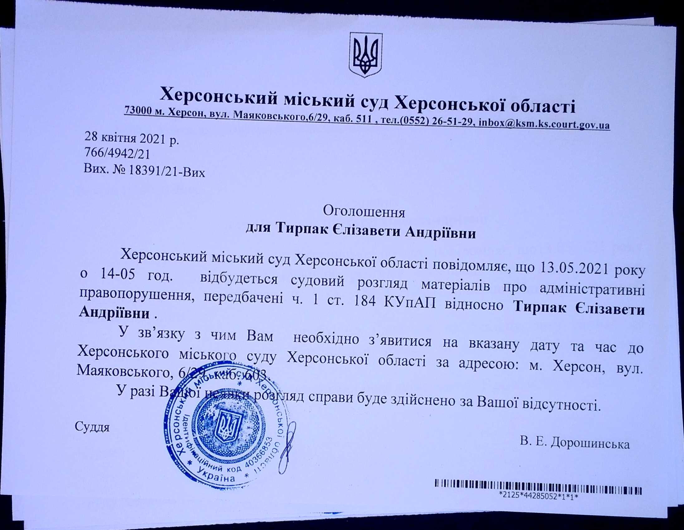 ОГОЛОШЕННЯ для Тирпак Єлізавети Андріївни