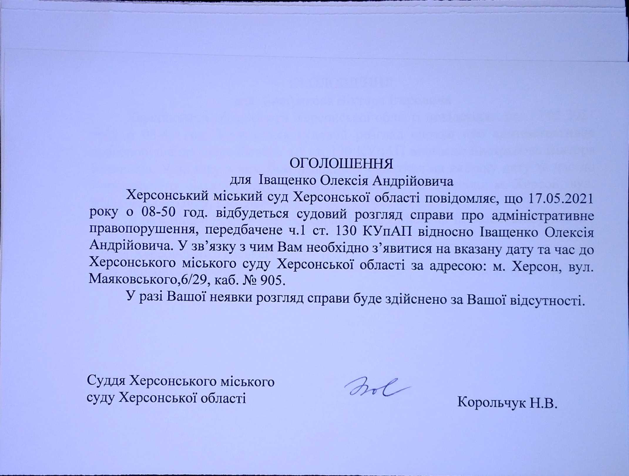 ОГОЛОШЕННЯ для Іващенко Олексія Андрійовича