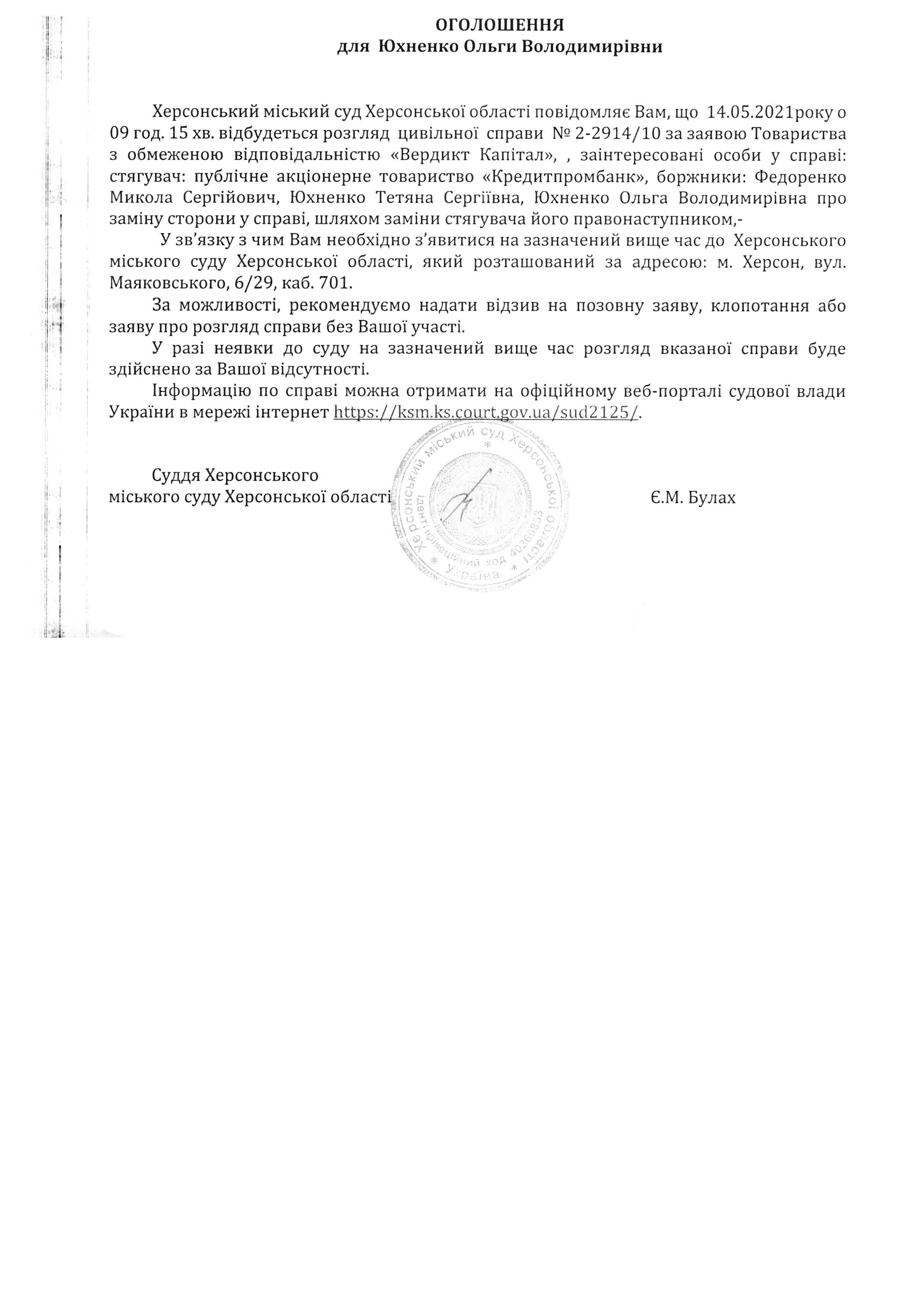 Оголошення для Юхненко Ольги Володимирівни