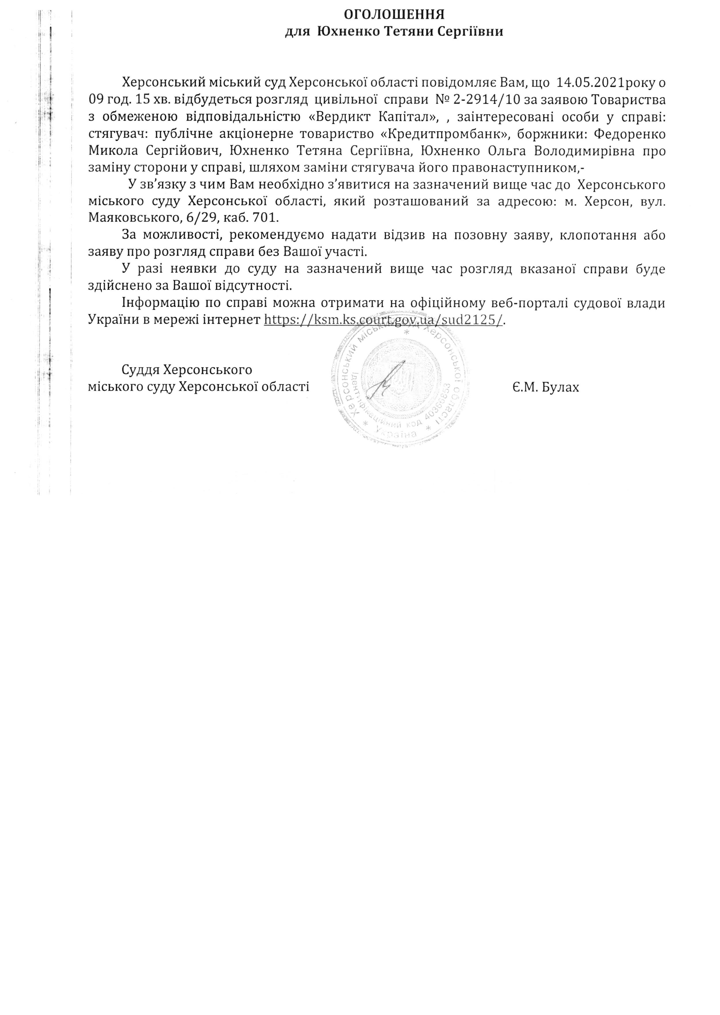 Оголошення для Юхненко Тетяни Сергіївни