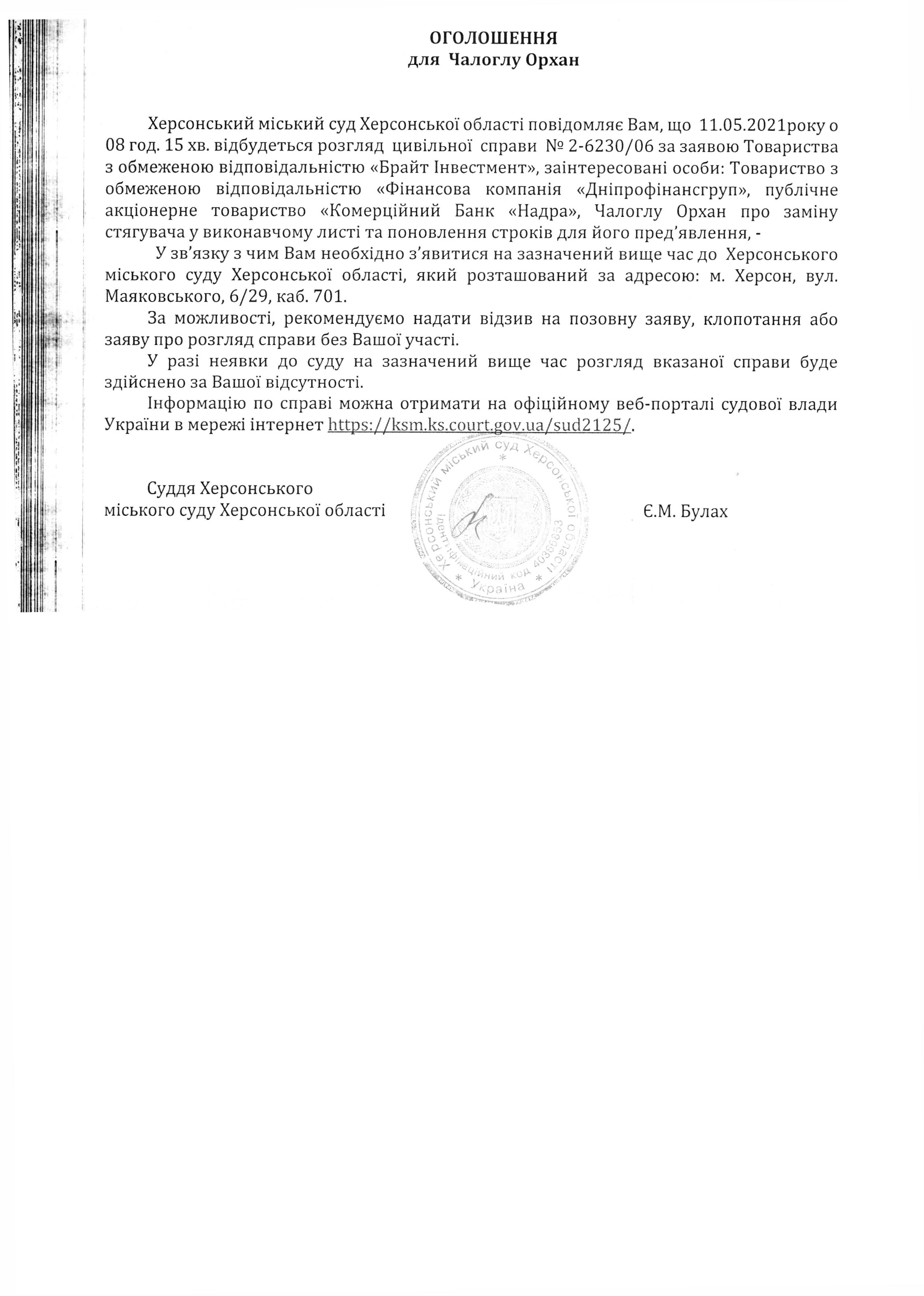 ОГОЛОШЕННЯ ПРО ВИКЛИК ДО СУДУ