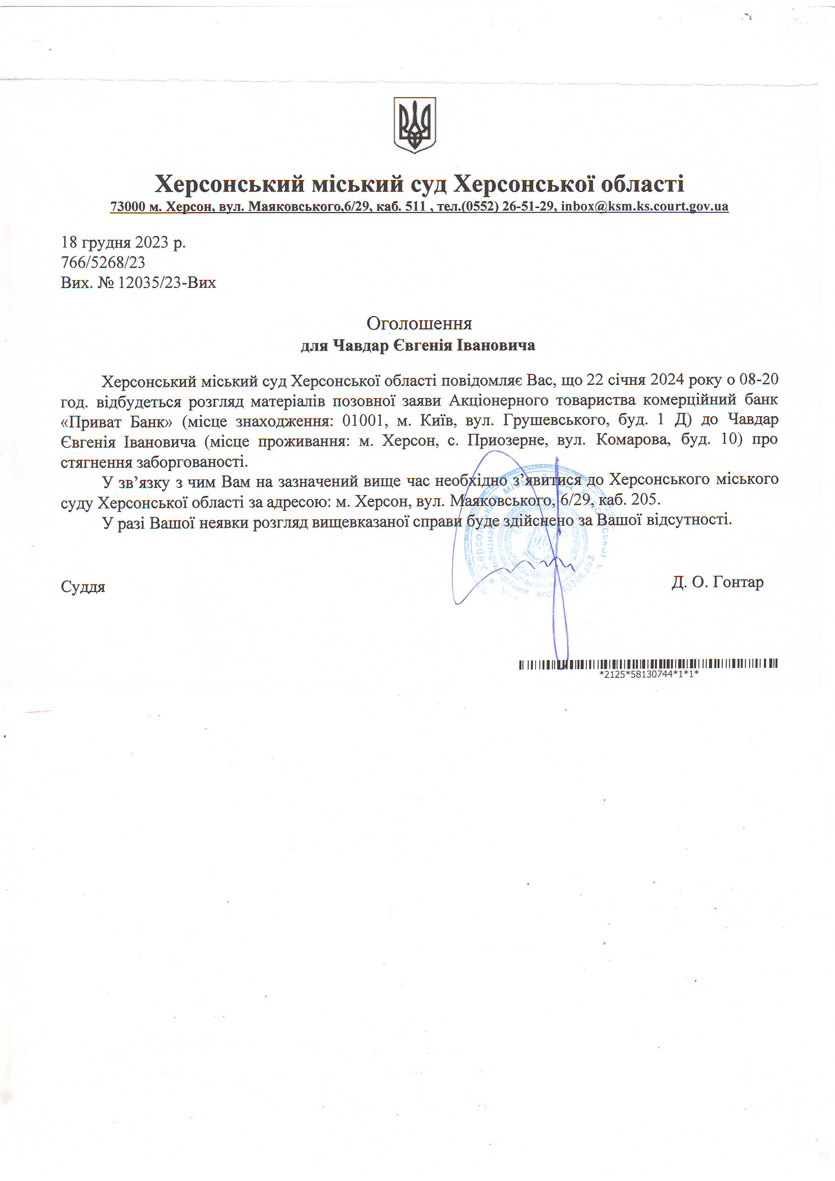 ОГОЛОШЕННЯ ПРО ВИКЛИК ДО СУДУ