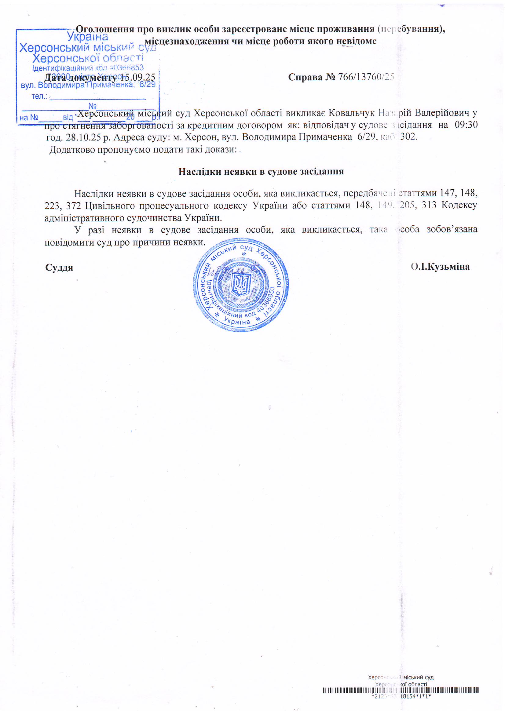 Оголошення для Ковальчука Назарія Валерійовича
