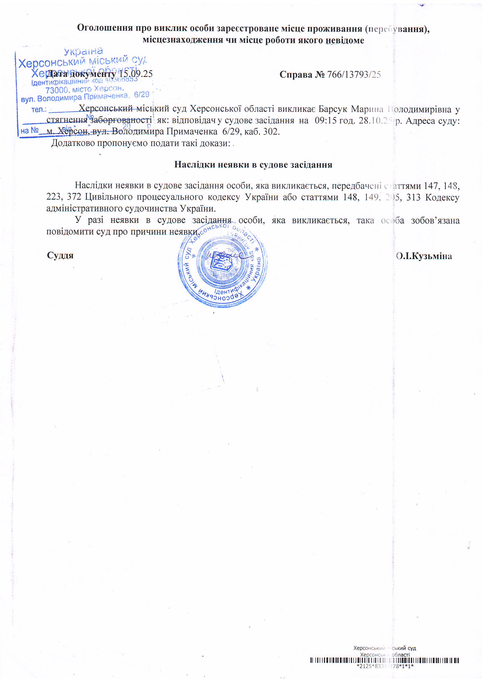 Оголошення для Барсук Марини Володимирівни