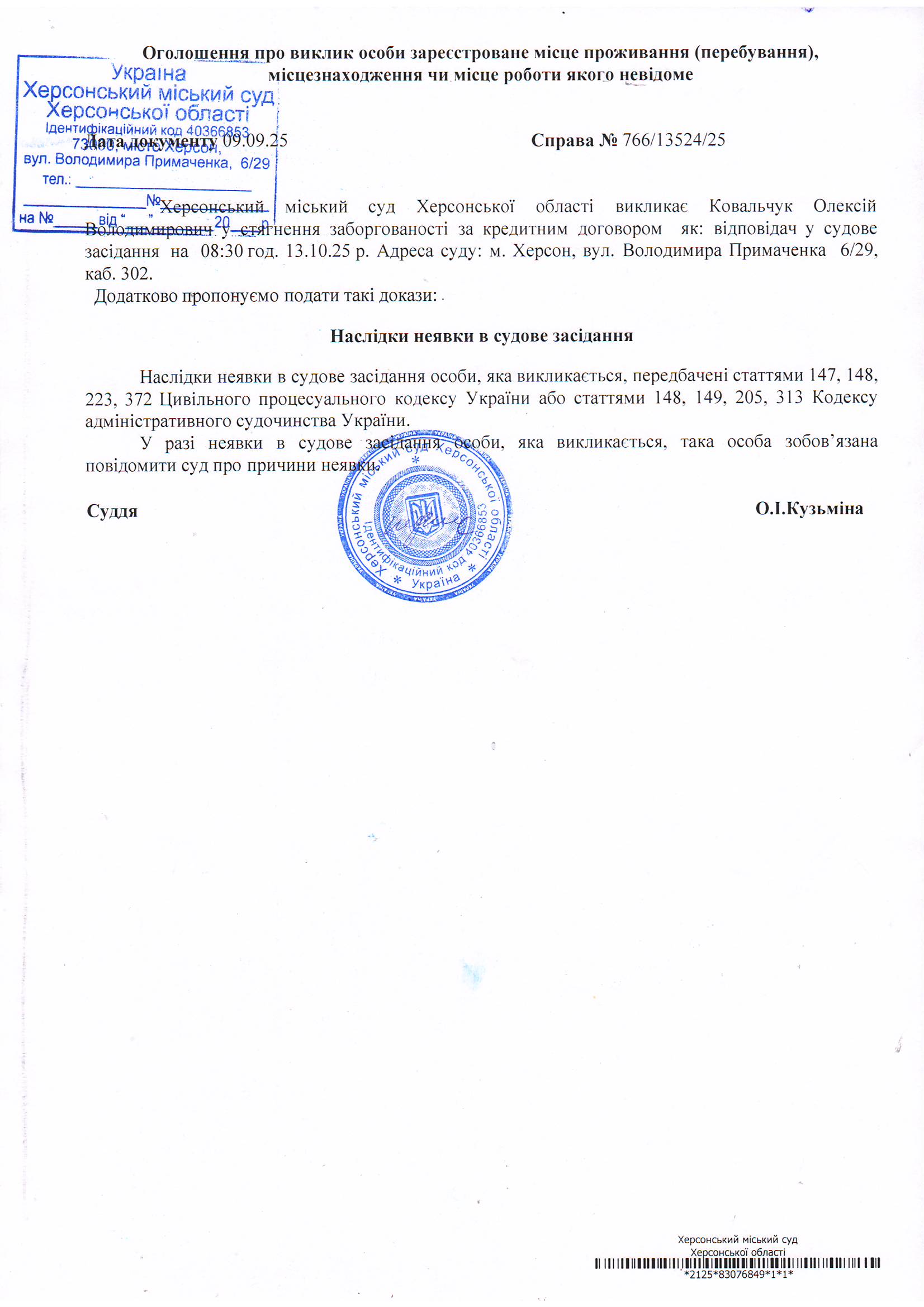 Оголошення для Ковальчука Олексія Володимировича
