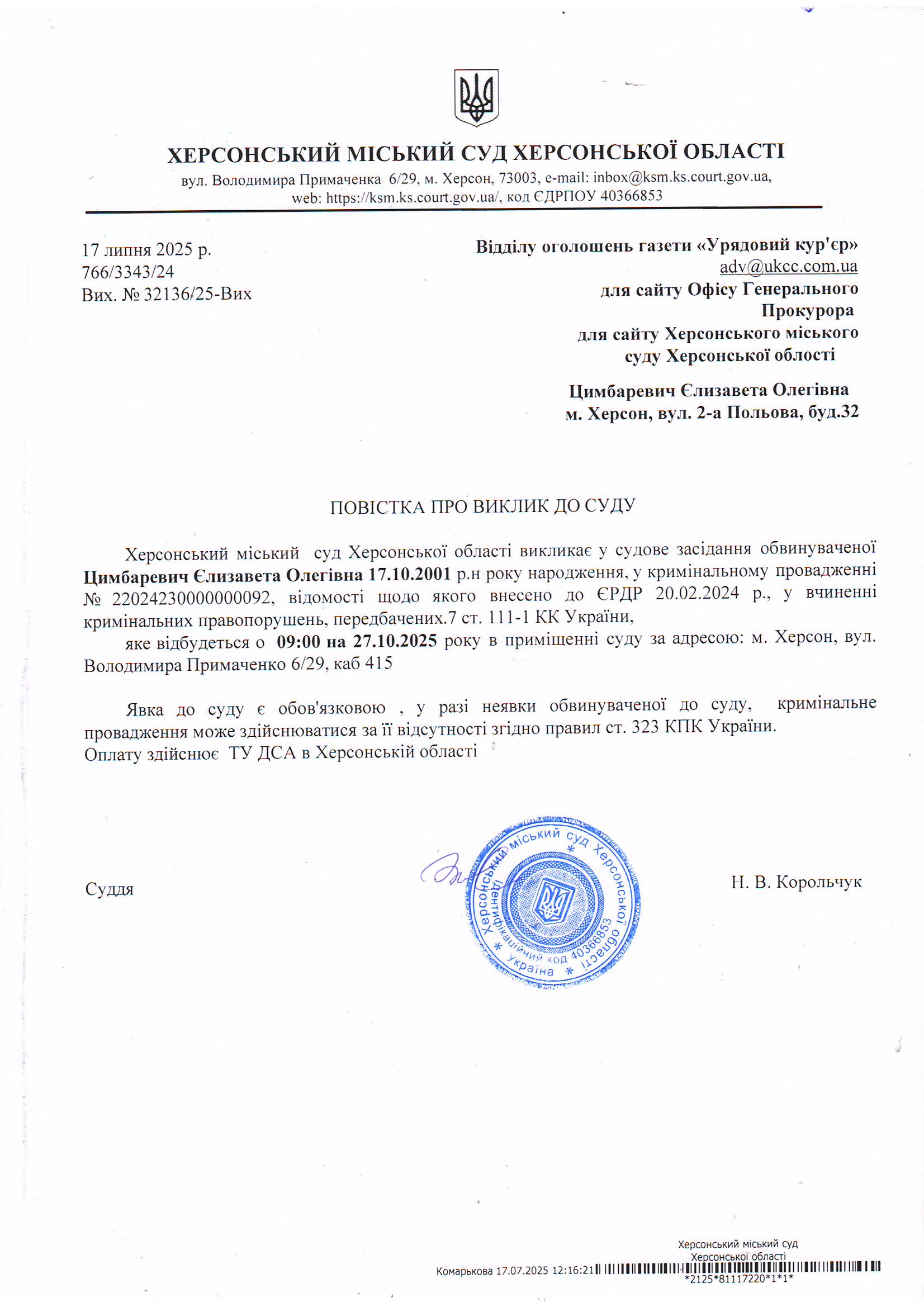 Оголошення для Цимбаревич Єлизавети Олегівни