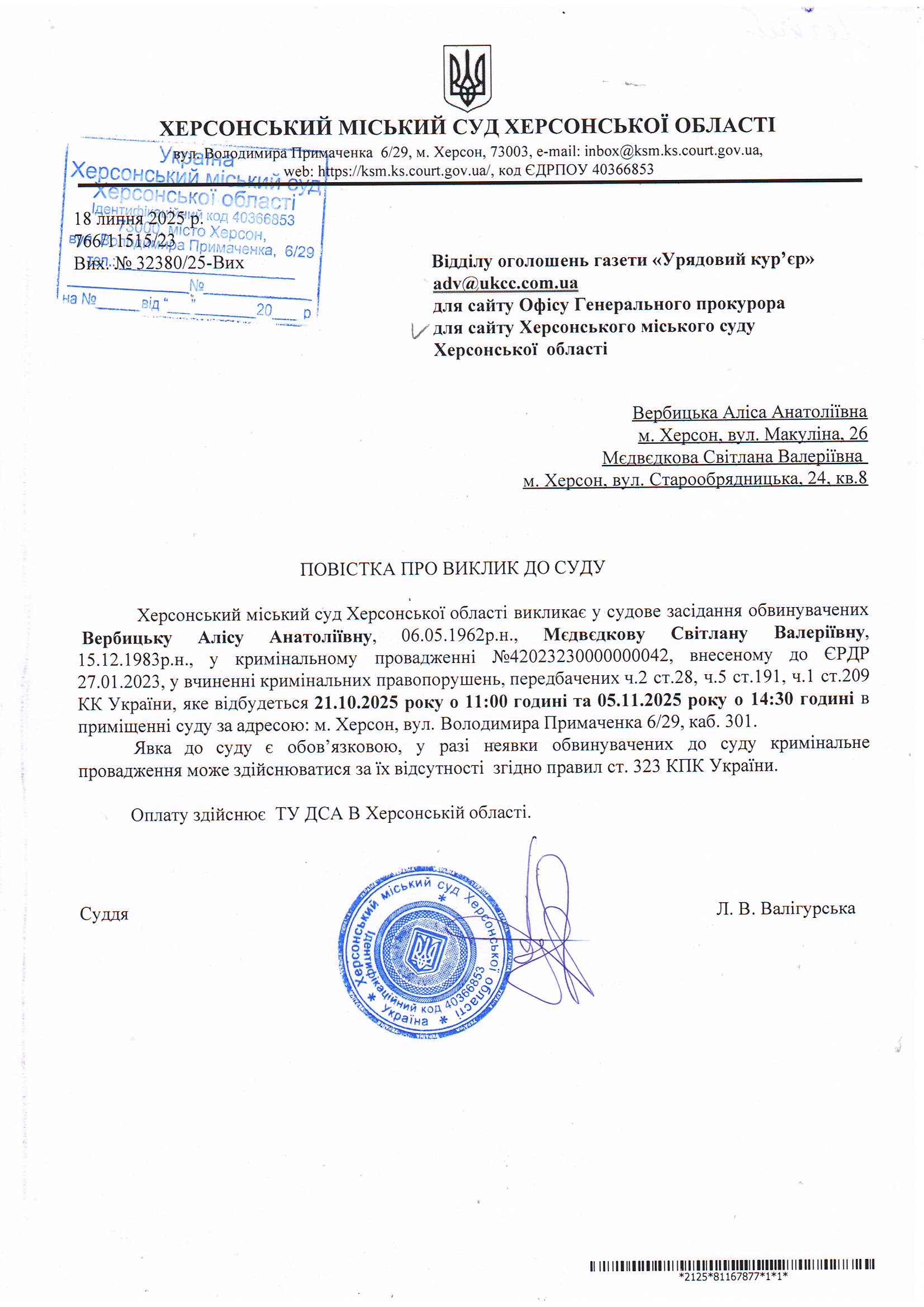 Оголошення для Вербицької Аліси Анатоліївни, Мєдвєдкової Світлани Валеріївни