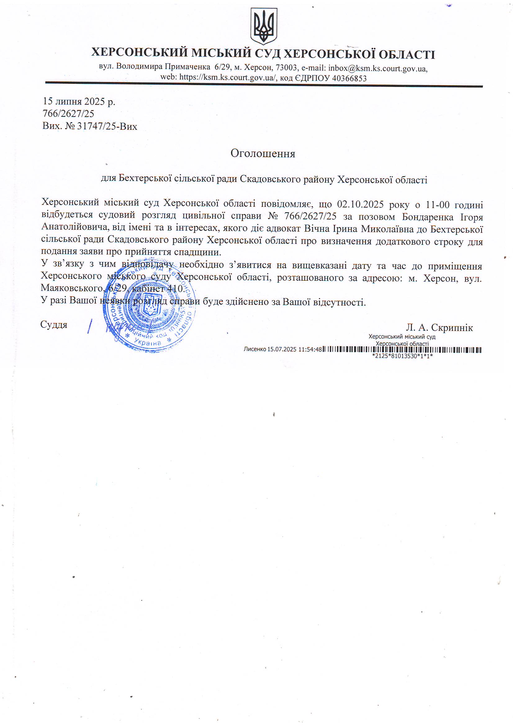 Оголошення для Бехтерської сільскої ради Скадовського району Херсонської області