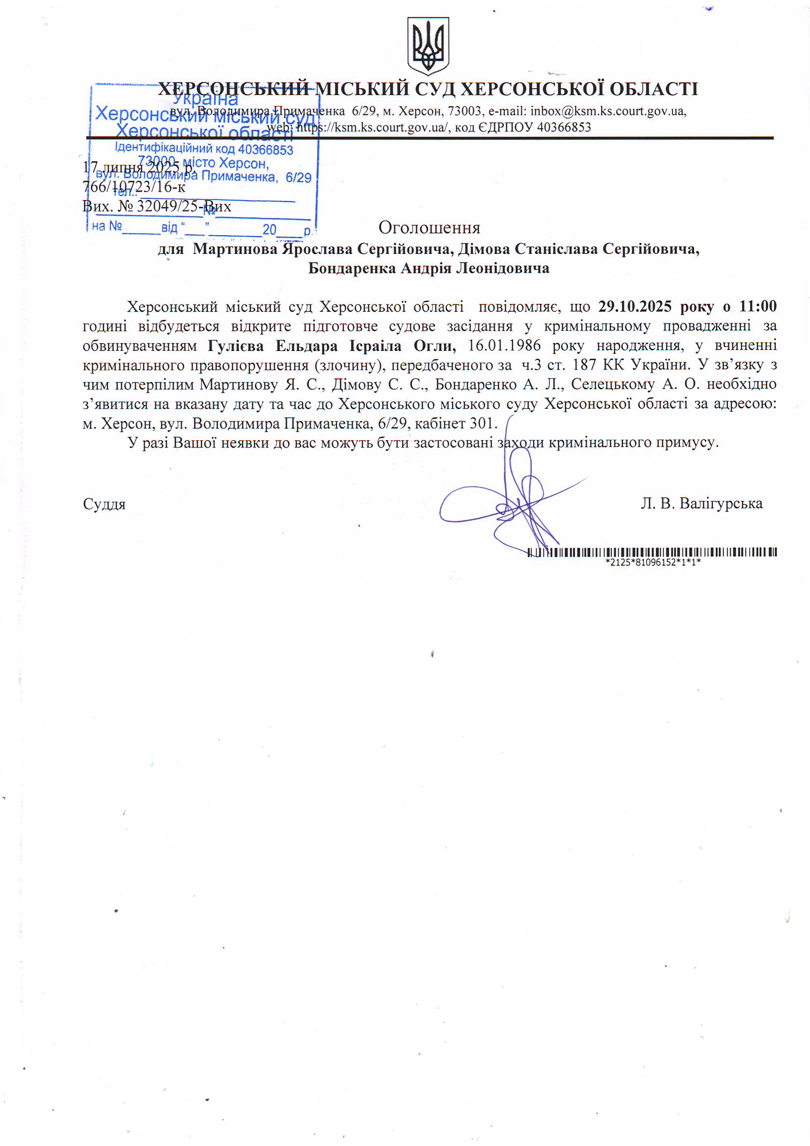 Оголошення для Мартинова Ярослава Сергійовича, Дімова Станіслава Сергійовича, Бондаренка Андрія Леонідовича, Селецького Андрія Олександровича