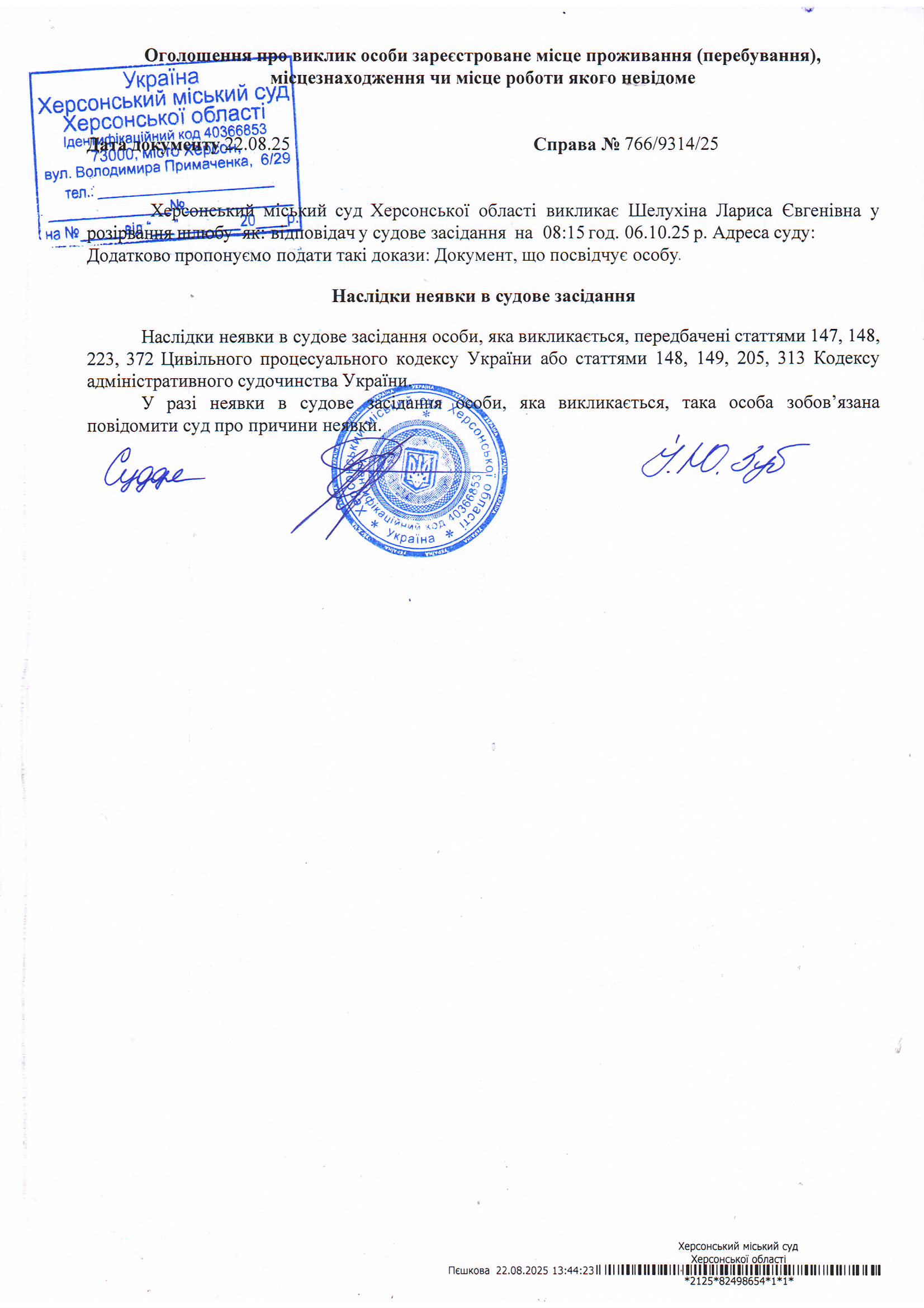 Оголошення для Шелухіної Лариси Євгенівни