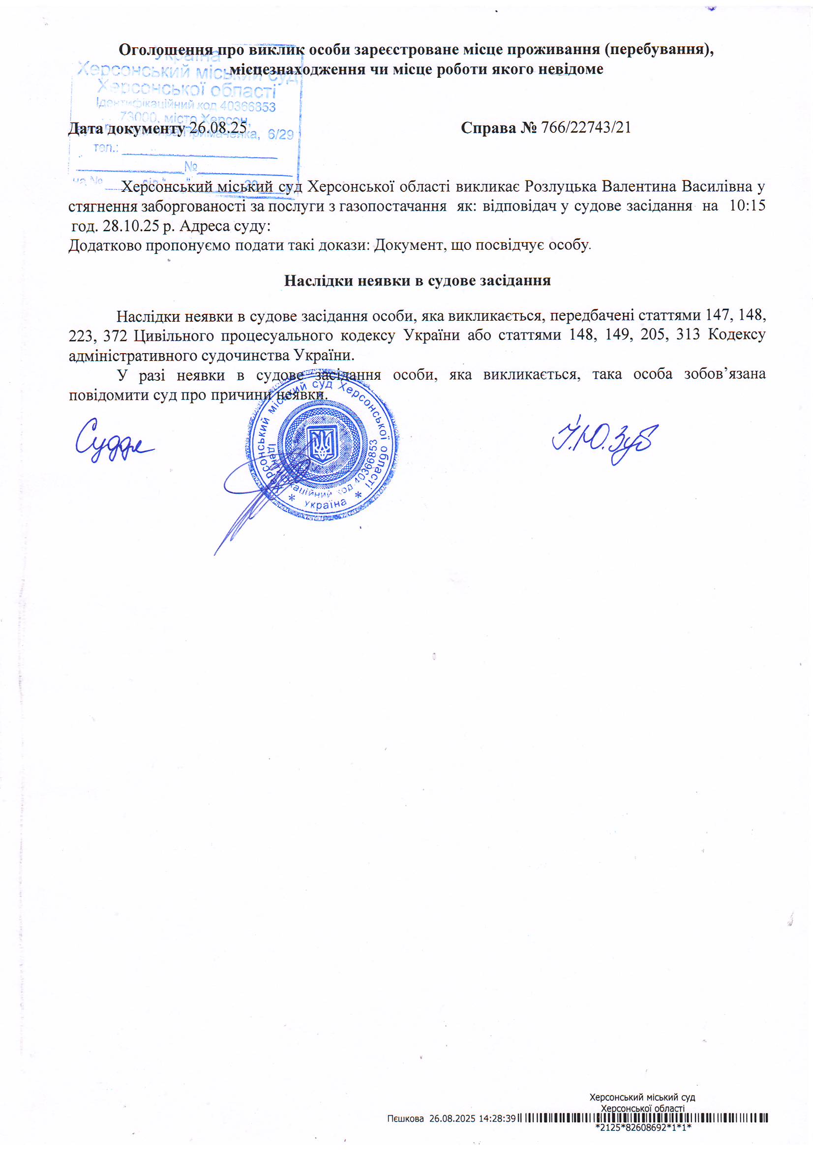 Оголошення для Розлуцької Валентини Василівни
