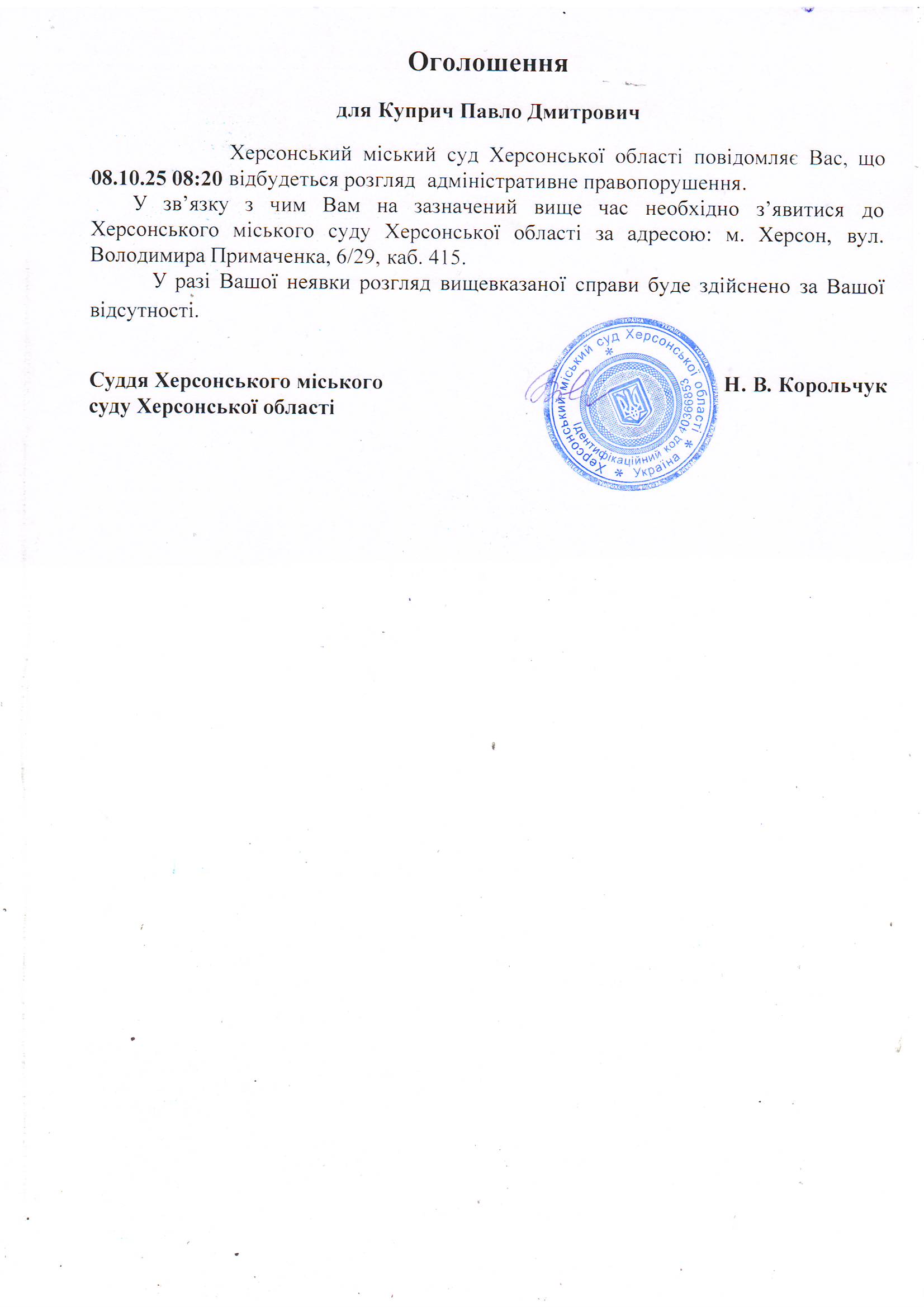 Оголошення для Куприча Павла Дмитровича