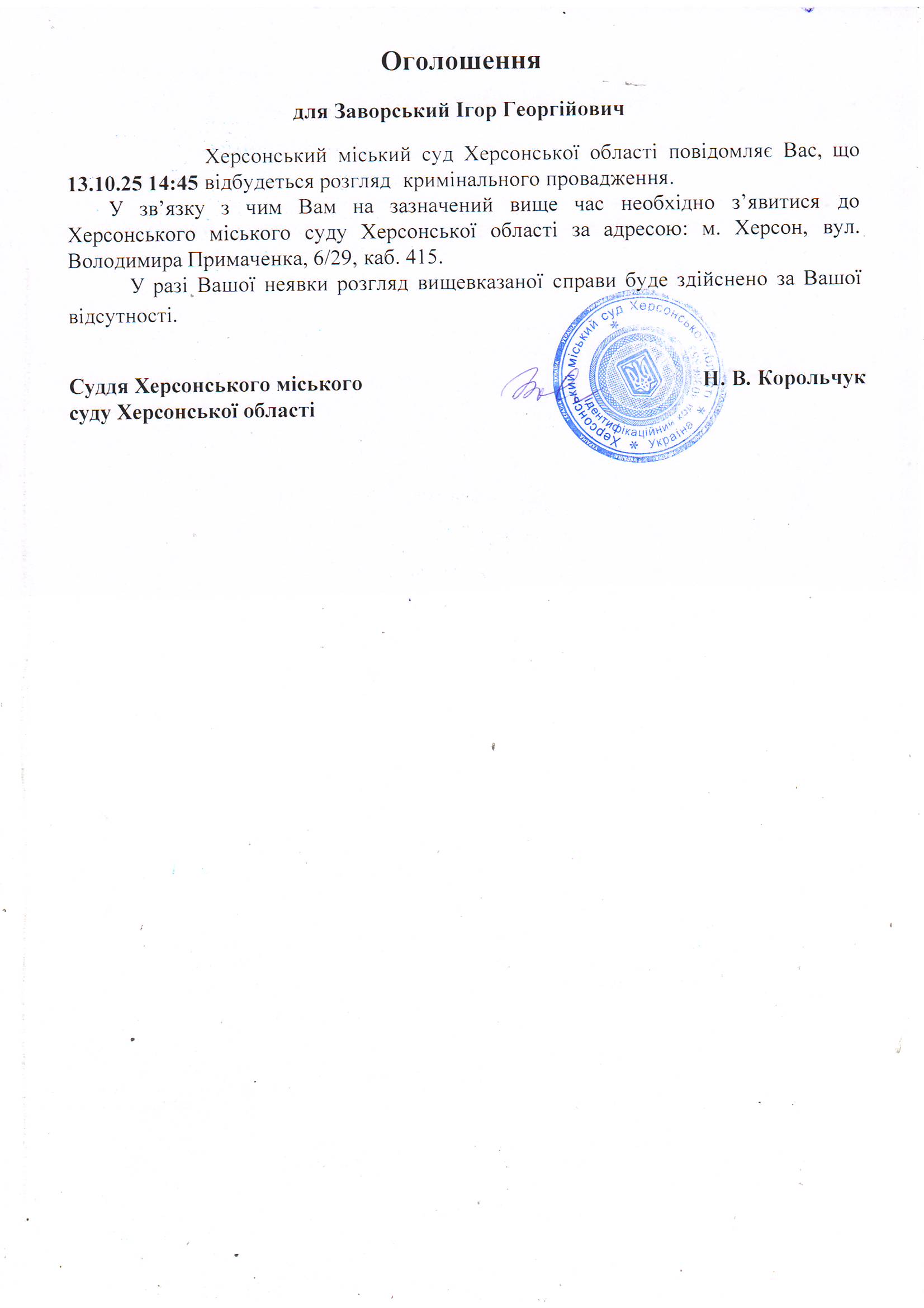 Оголошення для Заворського Ігоря Георгійовича