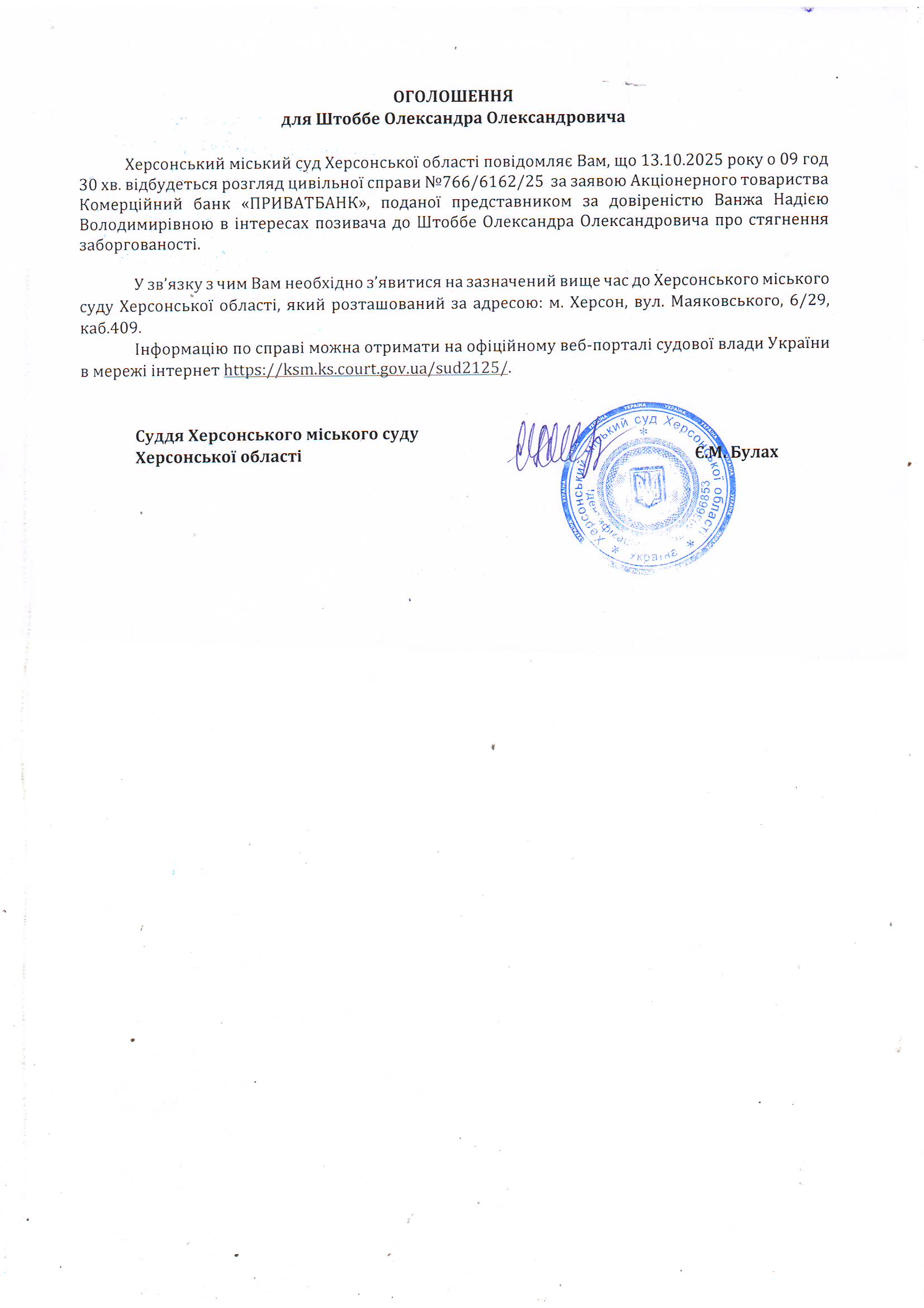 Оголошення для Штоббе Олександра Олександровича