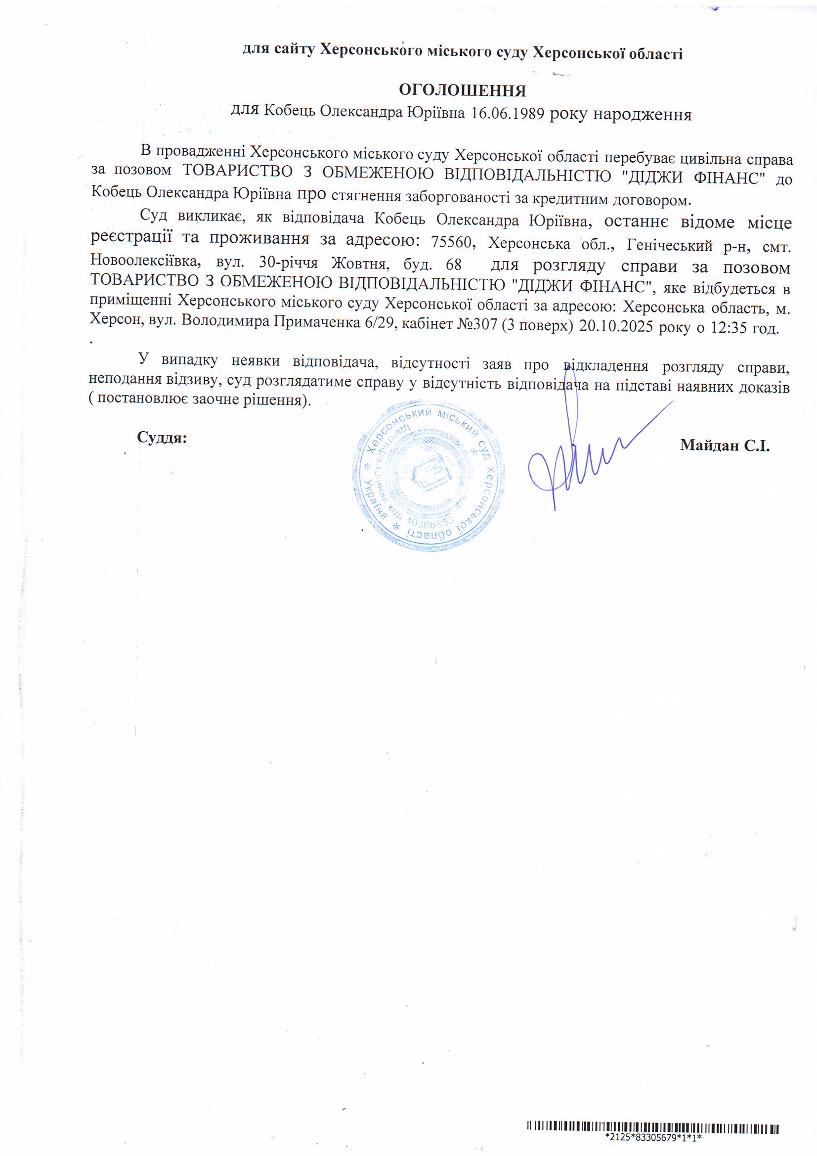 Оголошення для Кобець Олександри Юріївни