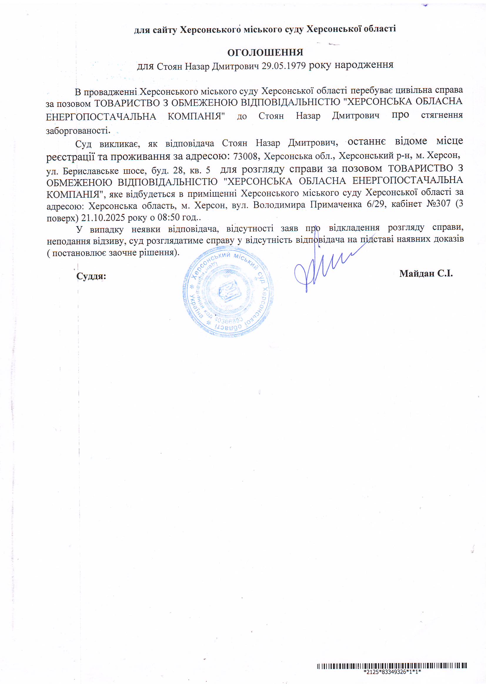 Оголошення для Стояна Назара Дмитровича