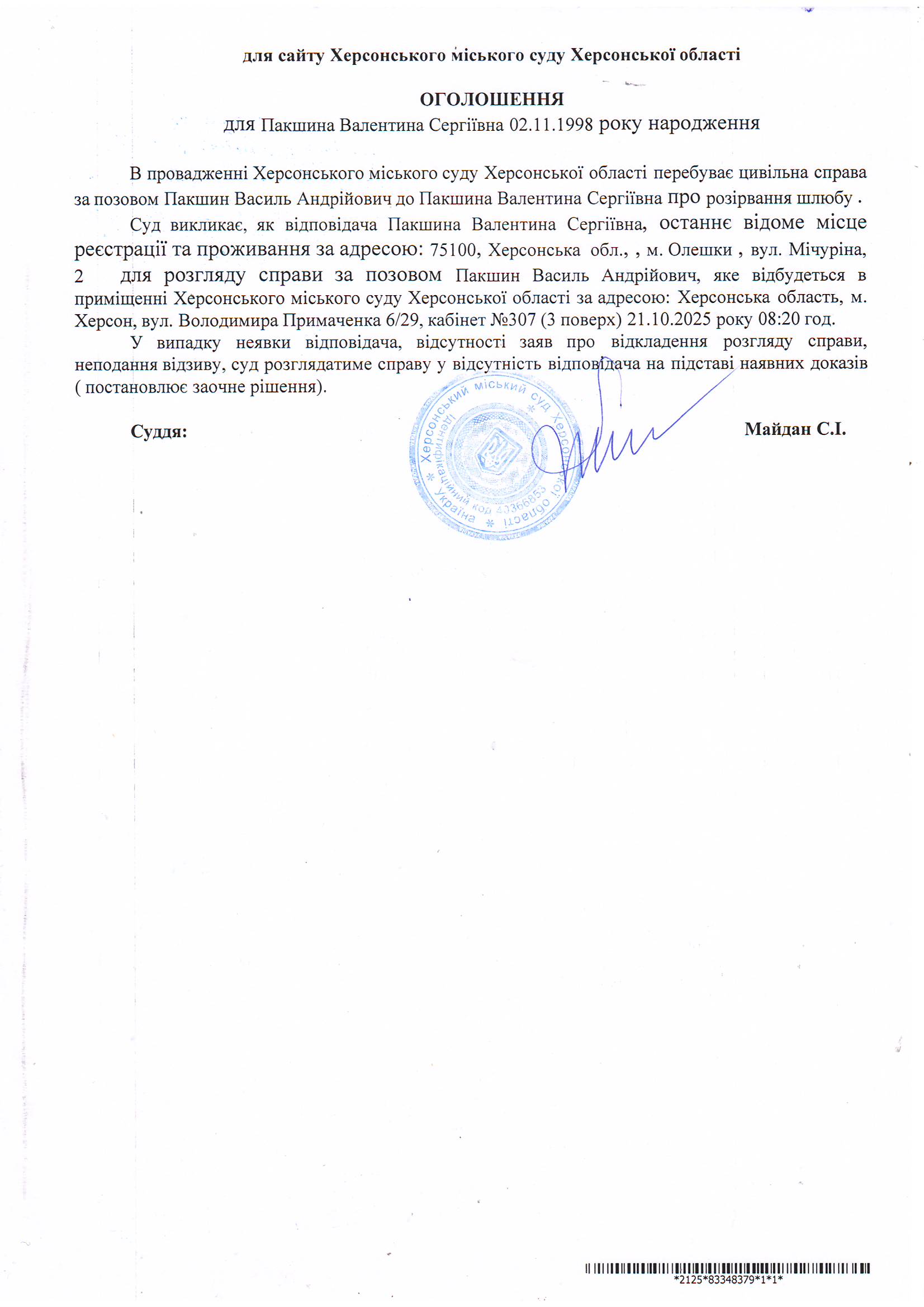 Оголошення для Пакшиної Валентини Сергіївни