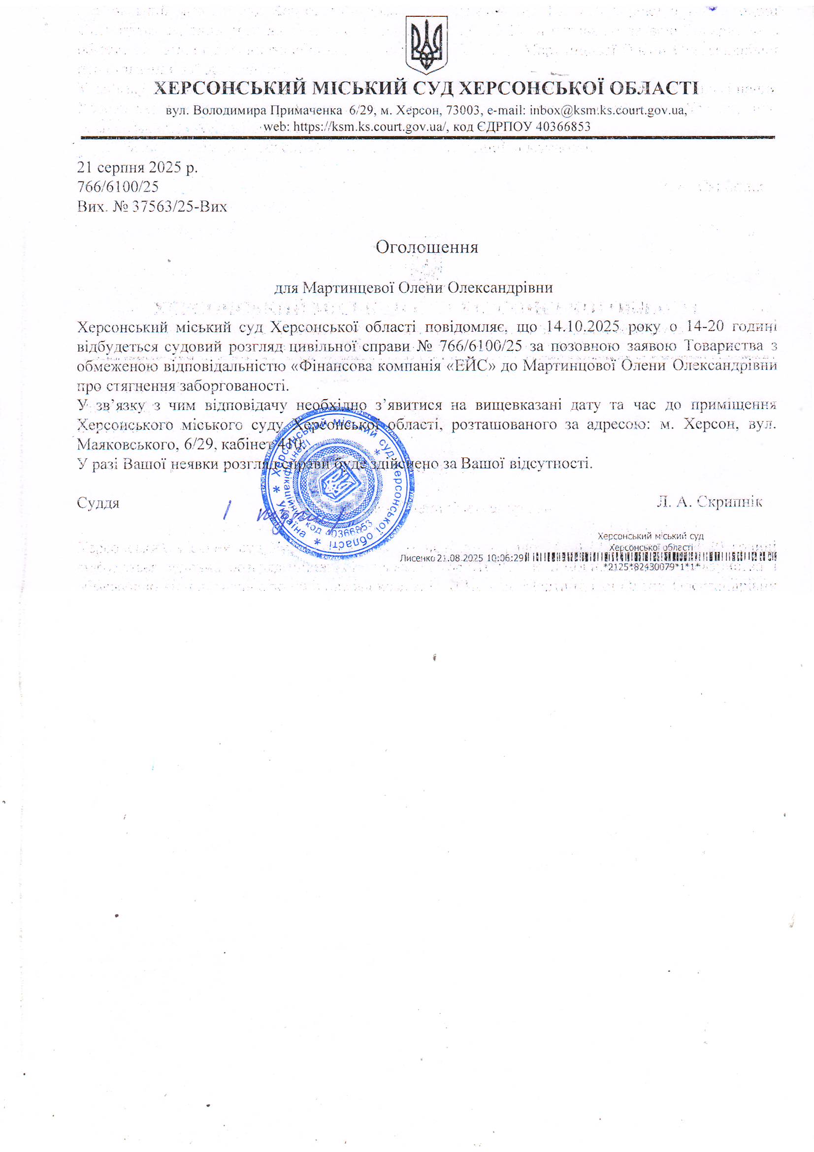 Оголошення для Мартинцевої Олени Олександрівни