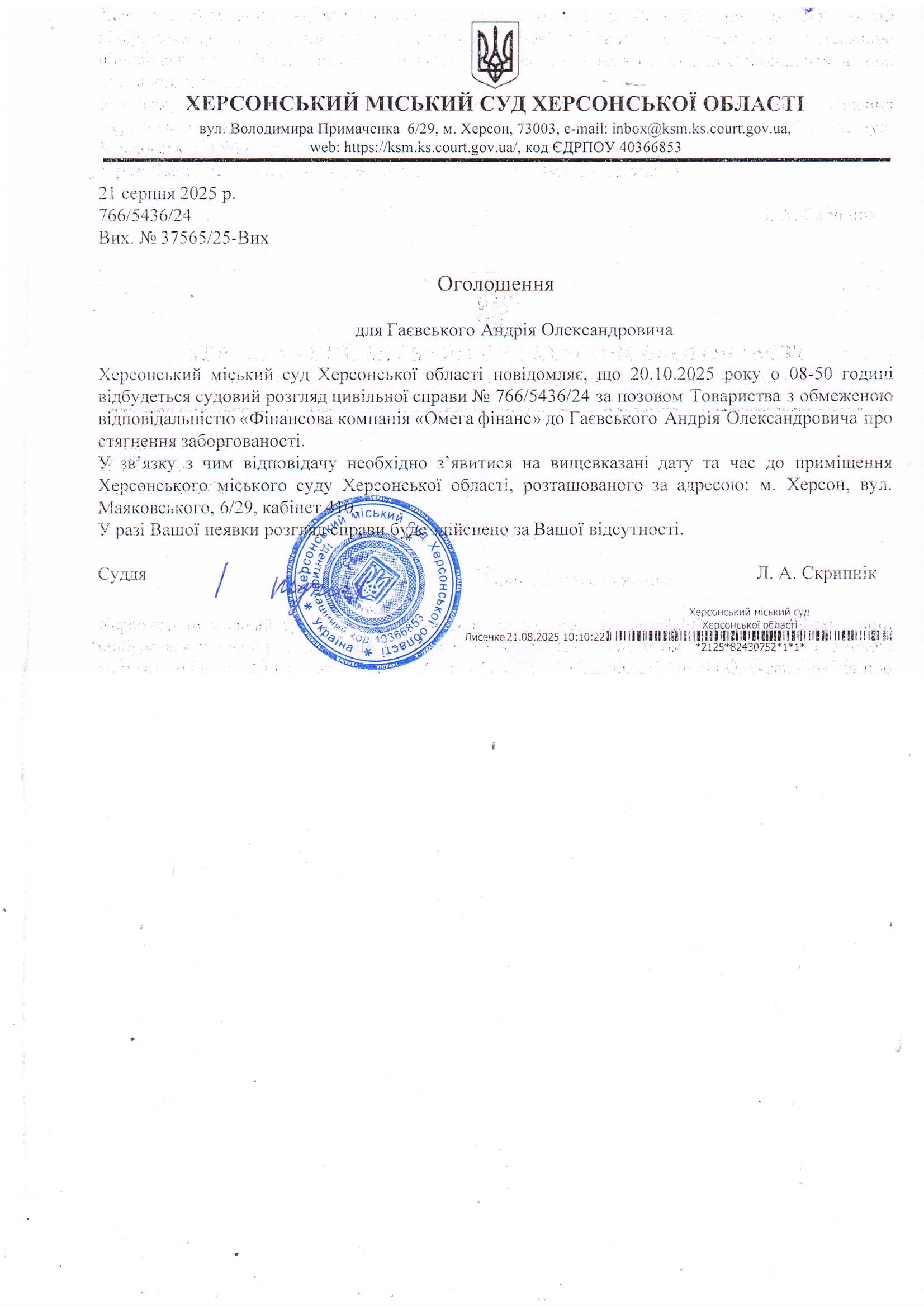 Оголошення для Гаєвського Андрія Олександровича