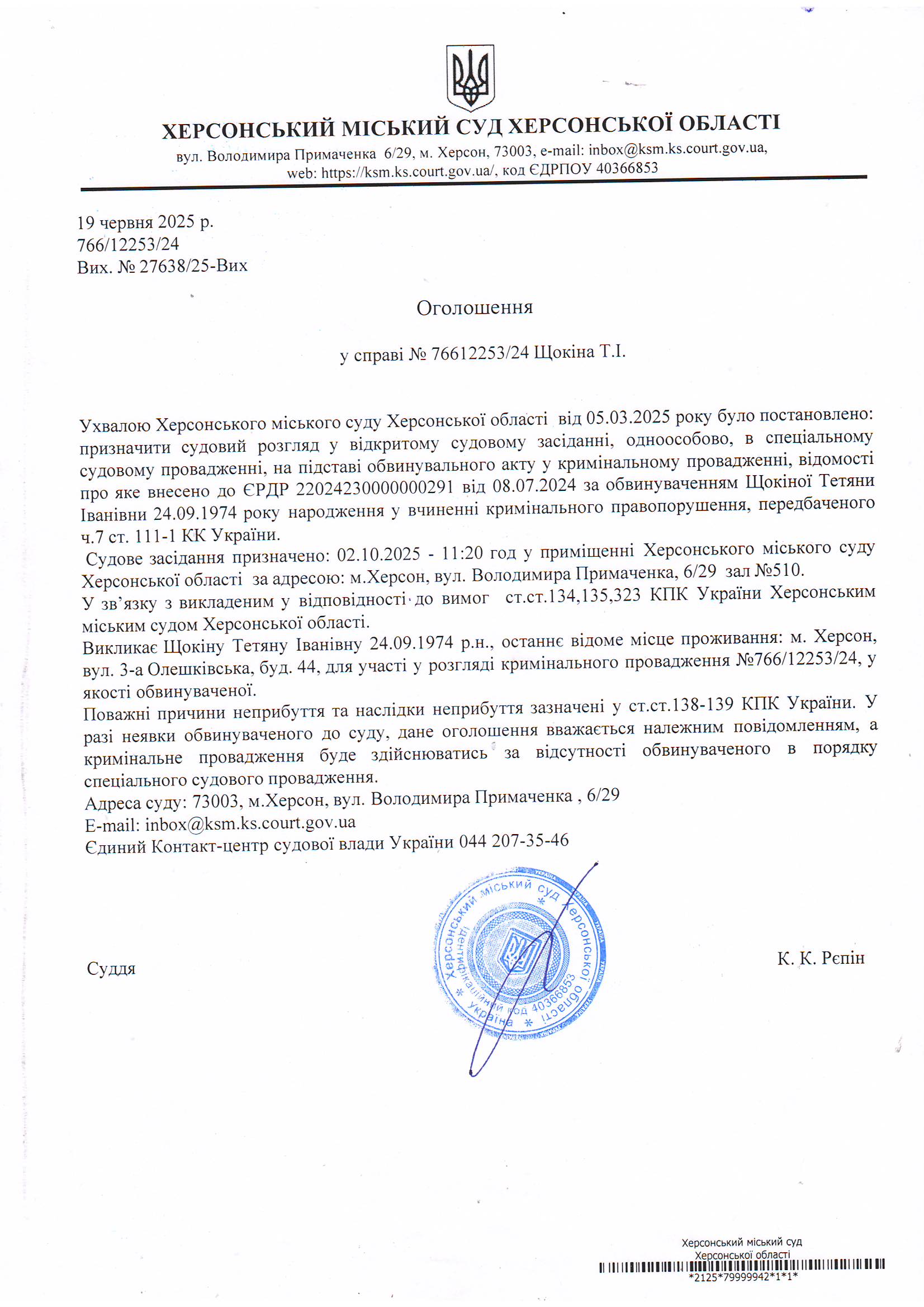 Оголошення для Щокіної Тетяни Іванівни
