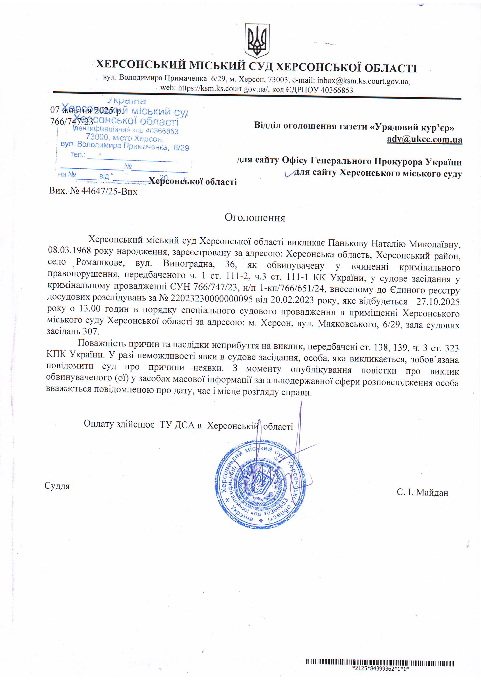 Оголошення про виклик особи в суд та повідомлення про судове рішення