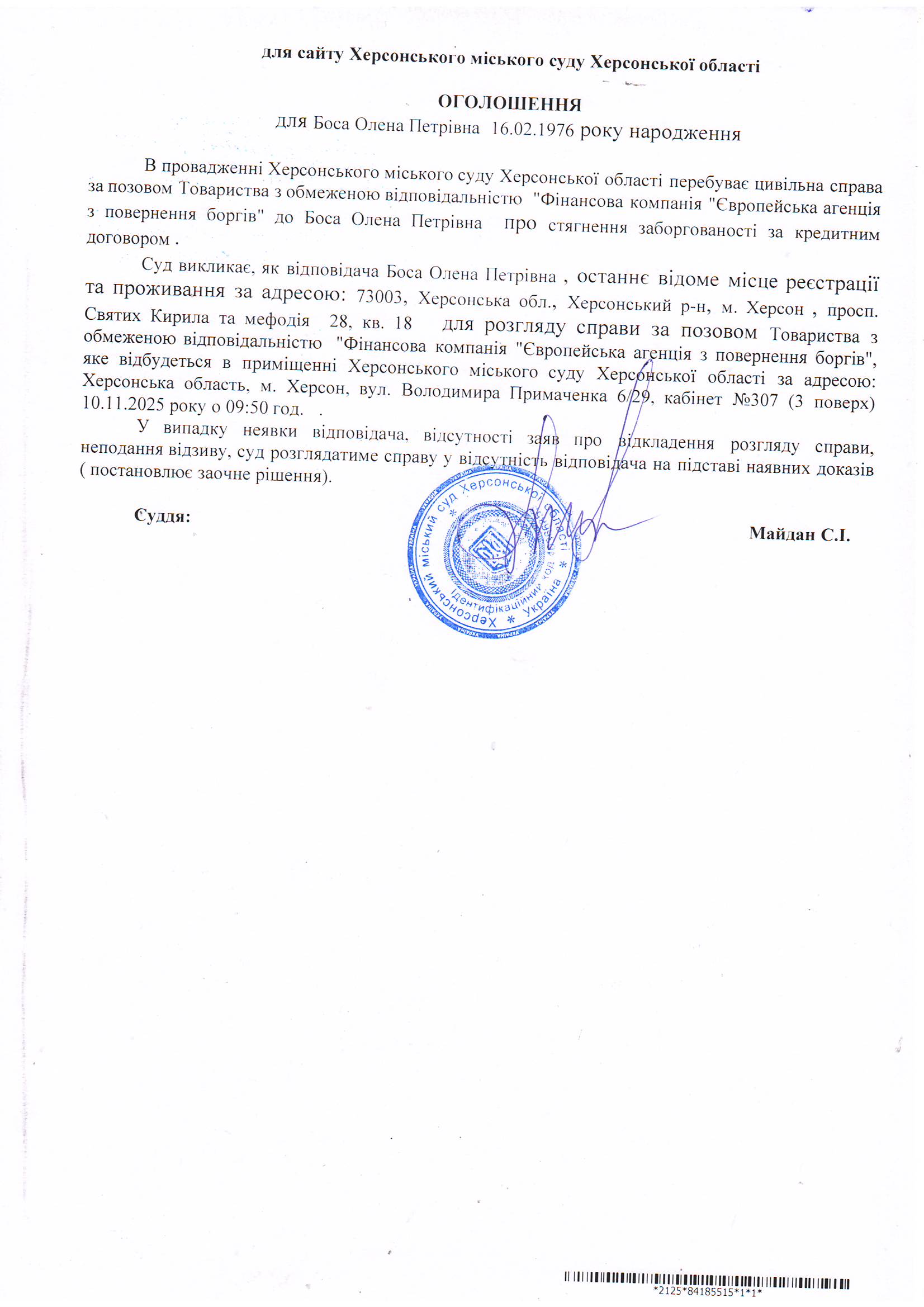ОГОЛОШЕННЯ ПРО ВИКЛИК ДО СУДУ