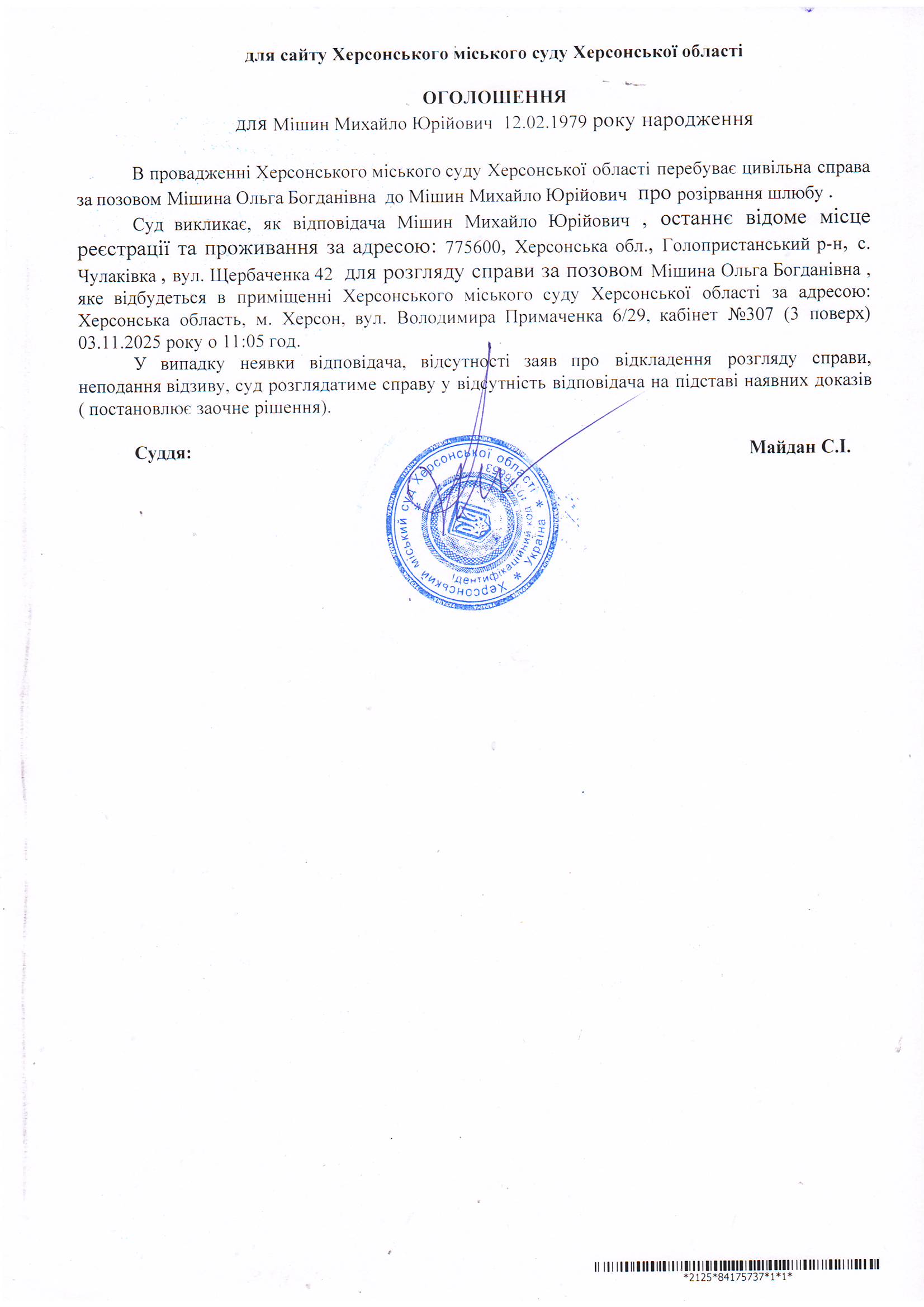 Оголошення для Мішина Михайла Юрійовича