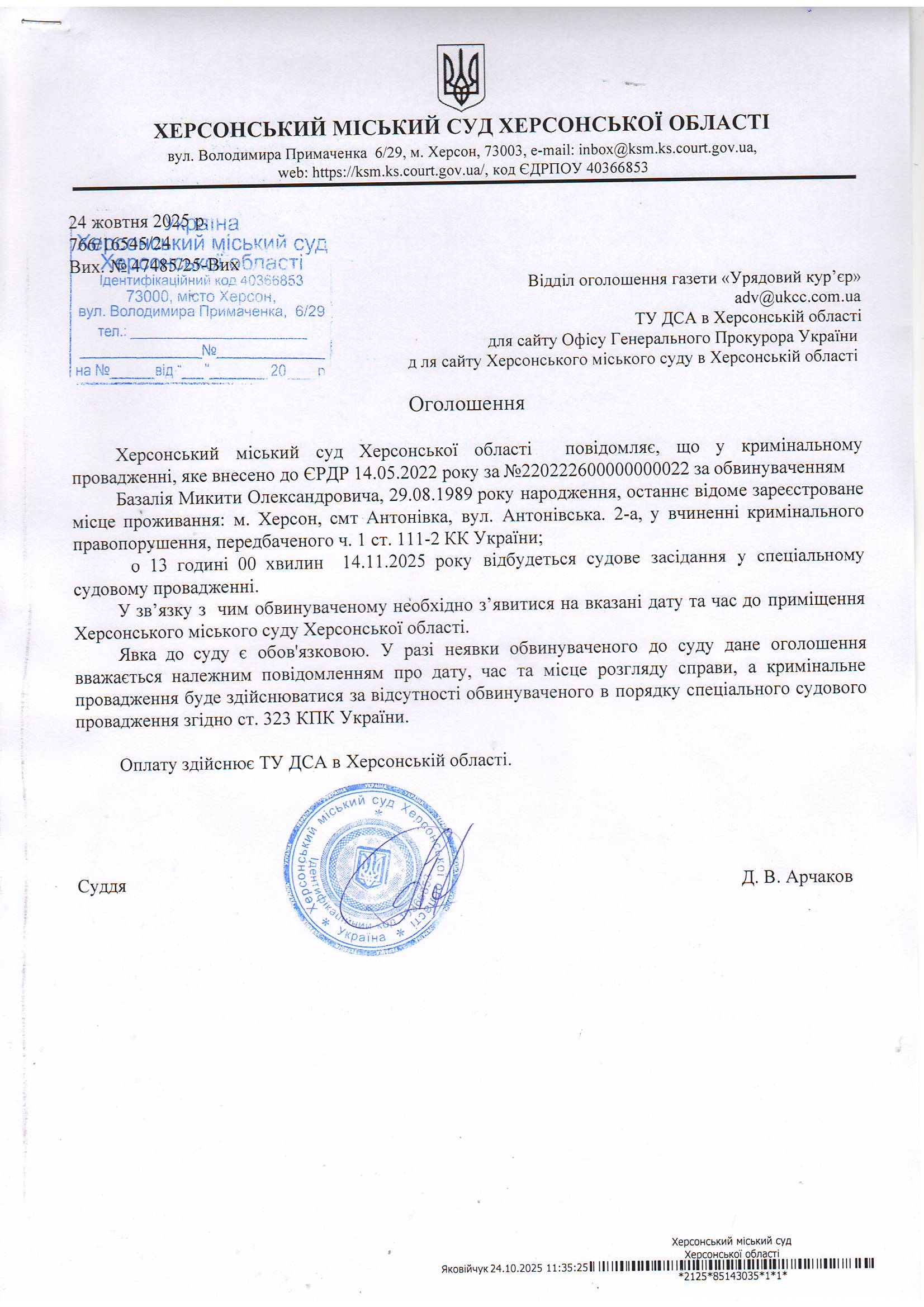 Оголошення про виклик особи в суд та повідомлення про судове рішення