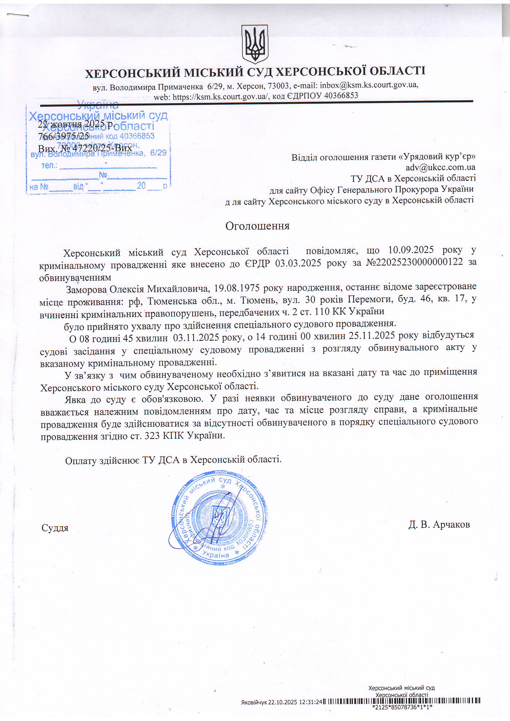 Оголошення про виклик особи в суд та повідомлення про судове рішення